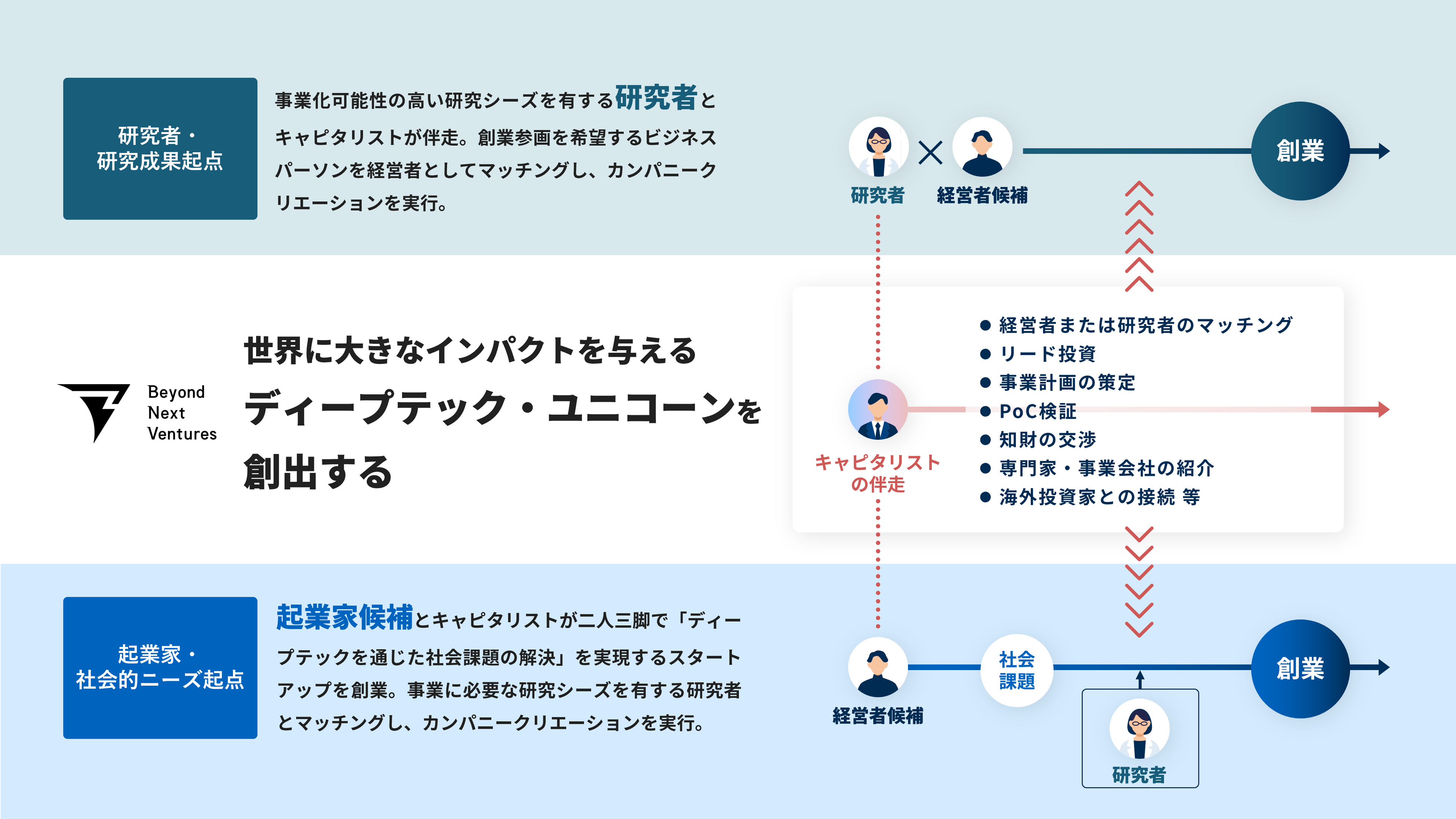 大学や研究機関から生まれることの多いディープテック分野は、その優れたサイエンス・テクノロジーの商業化を推進できる人材がいまだ不足しています。そこで当社では、最適な経営チームの組成に向けて、優れたシーズを持つ研究者と当社の3,000名規模の経営人材プールから経営者をマッチングする機会を提供することで、この課題の解決に取り組んでいます。そして、特定領域の専門家や当社キャピタリストが二人三脚で伴走しながら、事業化の検証・事業計画の構築・シード期での資金調達などを行い、より革新的なスタートアップを創業する活動を推進しています。