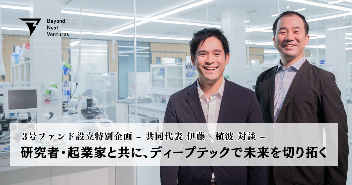 当社3号ファンドの設立に際して、経営者の想いや将来に対する展望をより具体的に皆様にお伝えするために、伊藤と植波の対談記事を公開いたします。本対談では、当社3号ファンドが目指すもの、なぜ今経営体制を強化するのか、そしてBeyond Next Venturesがディープテックにかける情熱、未来の展望などについて詳しくお話ししています。私たちの想いやビジョンをぜひ本記事を通じてご理解いただけたら幸いです。