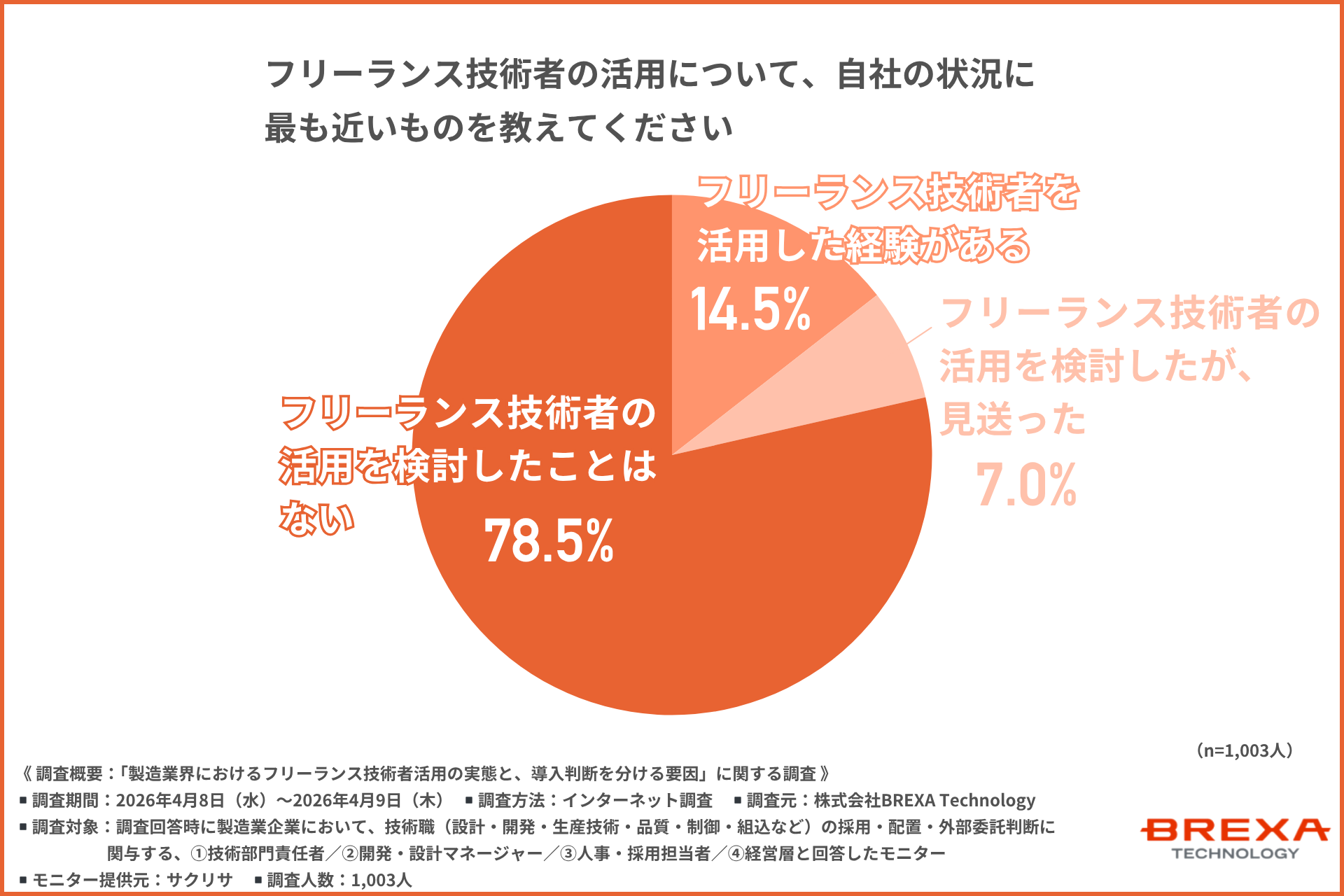 株式会社BREXA Technology(所在地:東京都千代田区、代表取締役:山﨑 高之)は、製造業企業において、技術職(設計・開発・生産技術・品質・制御・組込など)の採用・配置・外部委託判断に関与する、①技術部門責任者/②開発・設計マネージャー/③人事・採用担当者/④経営層を対象に「製造業界におけるフリーランス技術者活用の実態と、導入判断を分ける要因」に関する調査を行いました。