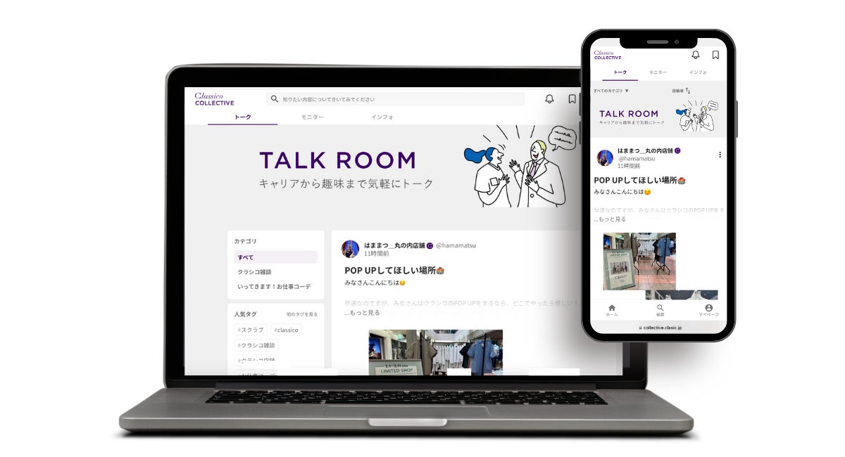 『Classico COLLECTIVE』は、医療従事者が立場や役割を超えてフラットにつながる場を提供する会員制のコミュニティ。登録は無料で、クラシコのアイテムを中心とした話題だけでなく、働き方や暮らし方に関する相談やキャリア選択のヒントなど、医療従事者が仕事も暮らしもより楽しめるようなコンテンツを発信しています。