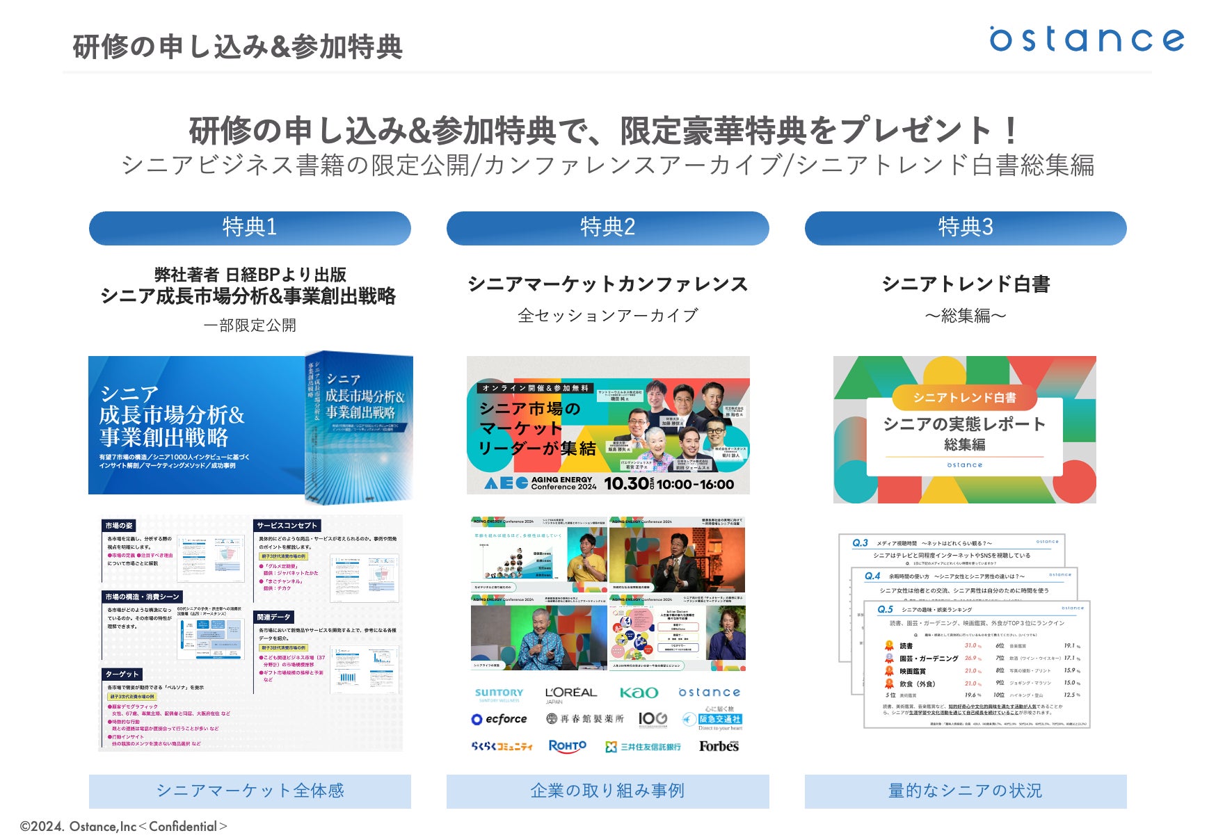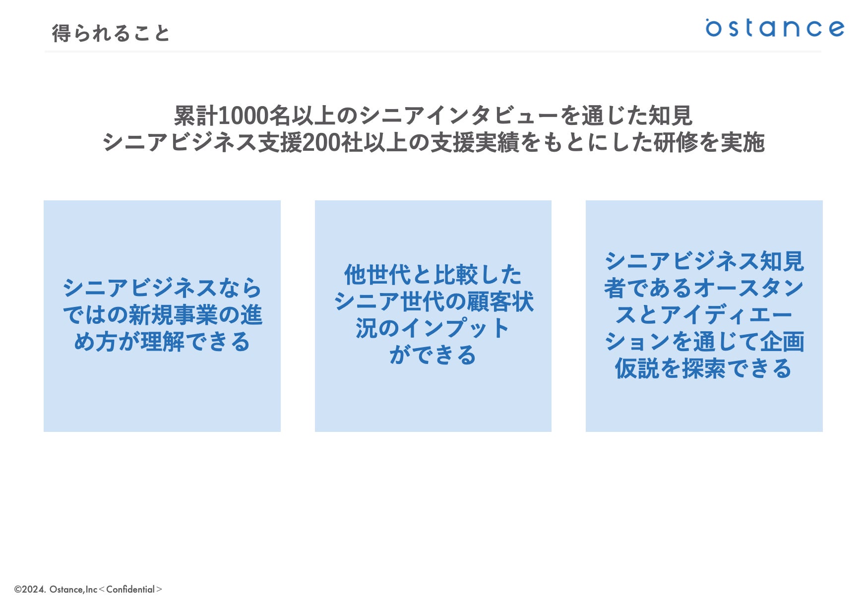 「シニアビジネス推進に必要な要素」を累計1000名以上のシニアインタビューを通じた知見、シニアビジネス支援200社以上の支援実績をもとにした研修を実施します。