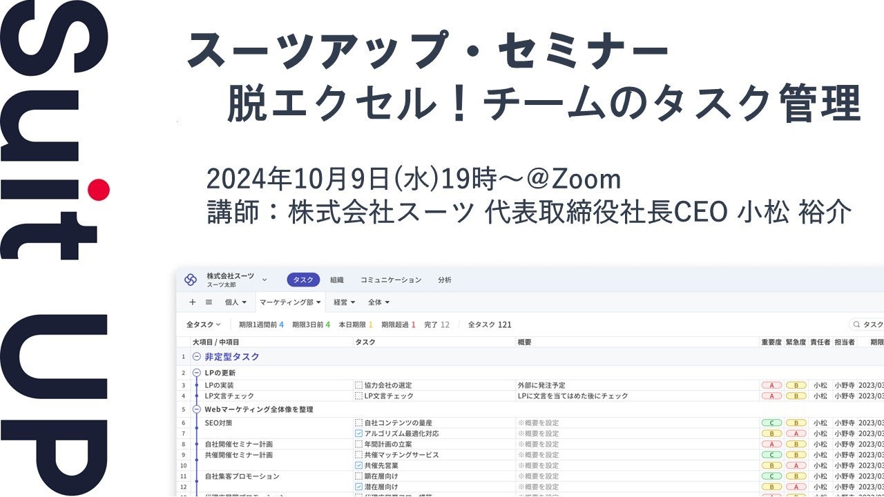 株式会社スーツ(所在地:東京都千代田区、代表取締役社長CEO:小松 裕介)は、2024年10月9日(水)19時から、当社代表の小松が講師を務めるスーツアップ・セミナー「脱エクセル!チームのタスク管理」を無料開催します。