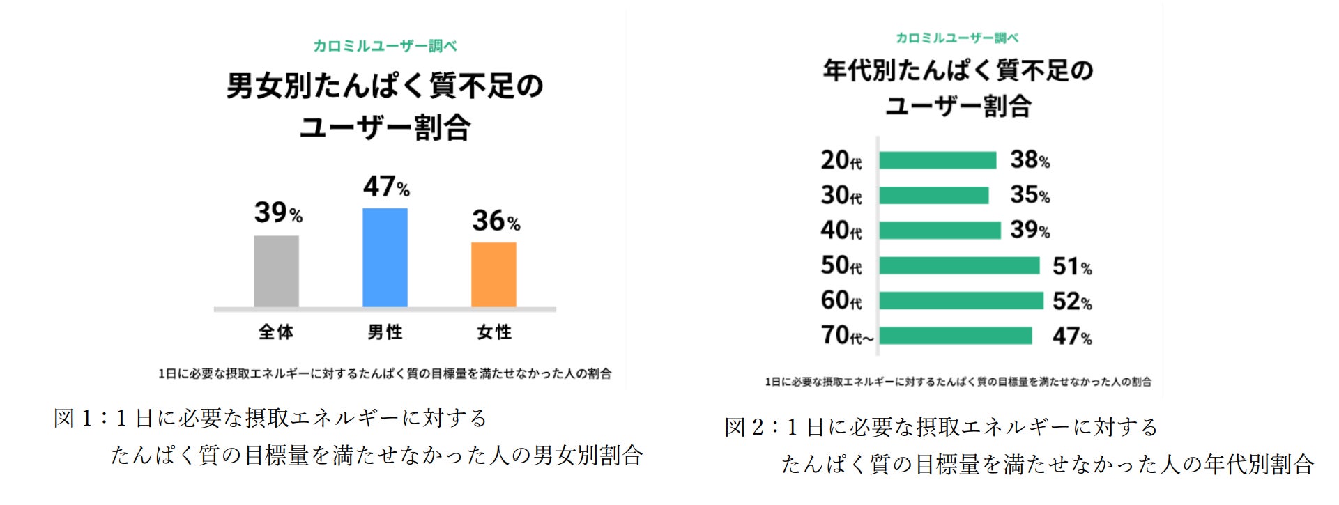 昨今の健康志向の高まりを受け、たんぱく質はアスリートやハードな筋トレにいそしむ人が摂る「プロテイン」以外にも健康な体づくりのため老若男女が意識的に摂取するようになっています。しかし、カロミルが2022年7月に実施したたんぱく質摂取量に関する調査では、男女別の摂取量をみると全体の約4割(図1)、年代別の摂取量では50代・60代の半数以上が必要量を摂取できていない(図2)ことが判明しました。