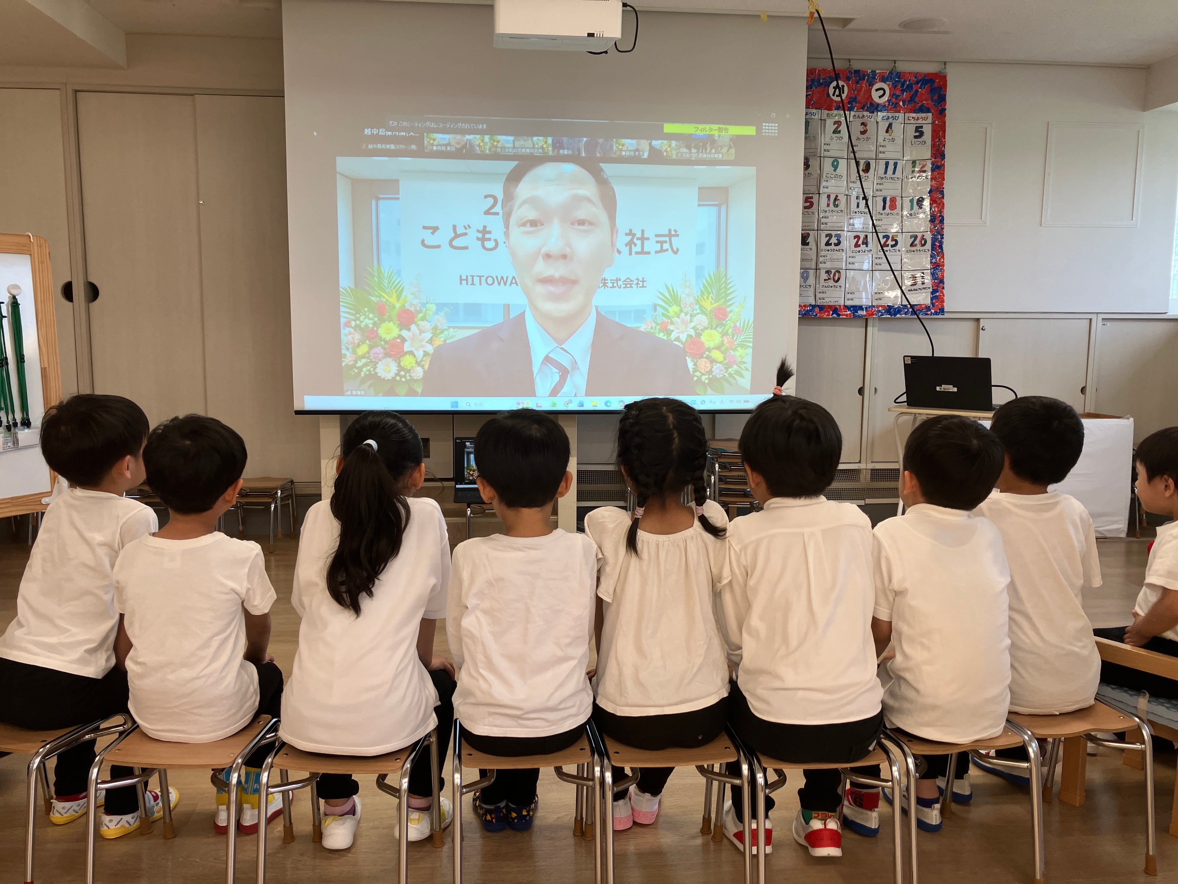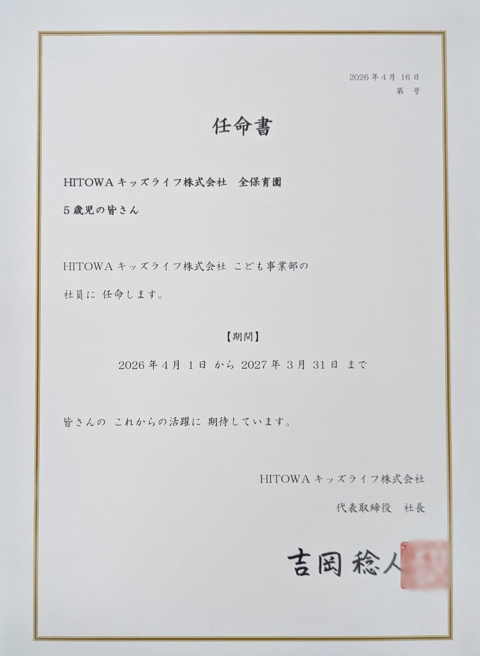 生活総合支援サービスを展開するHITOWAグループで、子育て支援事業を展開するHITOWAキッズライフ株式会社(本社:東京都港区、代表取締役社長:吉岡 稔人、以下「HITOWAキッズライフ」)は、2026年4月16日(木)、運営する保育園の5歳児クラスを対象とした「2026年度 こども事業部 入社式」をオンラインにて開催いたしました。今年度は88園、総勢980名の園児たちが参加し、「こども事業部」の新入社員として任命されました。