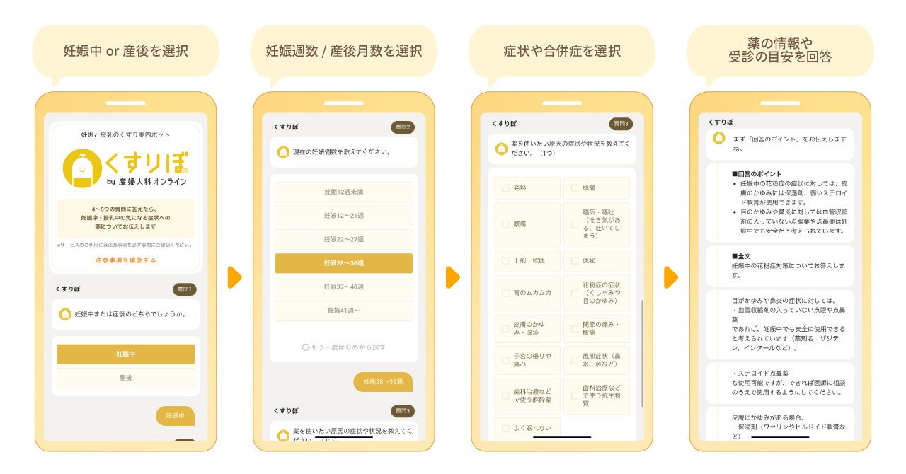 そこで、チャットボットサービス「くすりぼ」を開発するに至りました。シンプルな操作でご自身の状況を入力していくだけで、妊娠週数や産後月数、授乳状況、お持ちの合併症・持病を踏まえた薬の情報(回答文)が表示されます。膨大な相談データをベースに開発したもので、回答文のパターンは2000種類以上にも及び、これは過去に例のない情報量を持つサービスだと考えています。また、安全性にも十分考慮して作成しました。参考情報として安心してお使いいただけることと思います。