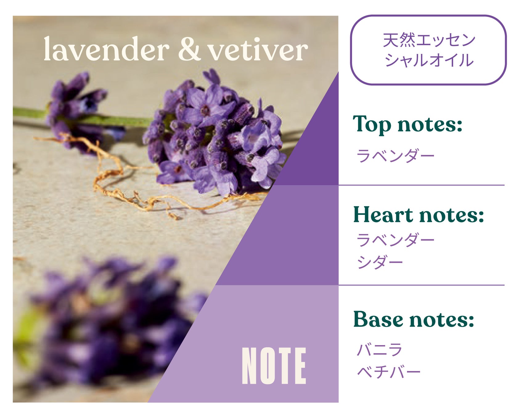 身体と心を再生させる「休息」は生きていく上で欠かせないもの。環境に配慮して栽培されたフランス プロバンス産のラベンダーの穏やかで心地の良い香りと、マダガスカル産のスモーキーでウッディなベチバーの香りは、緊張した身体をほぐしたい時や、心に安らぎを生みたい時、質の高い休息をとりたい時におすすめです。