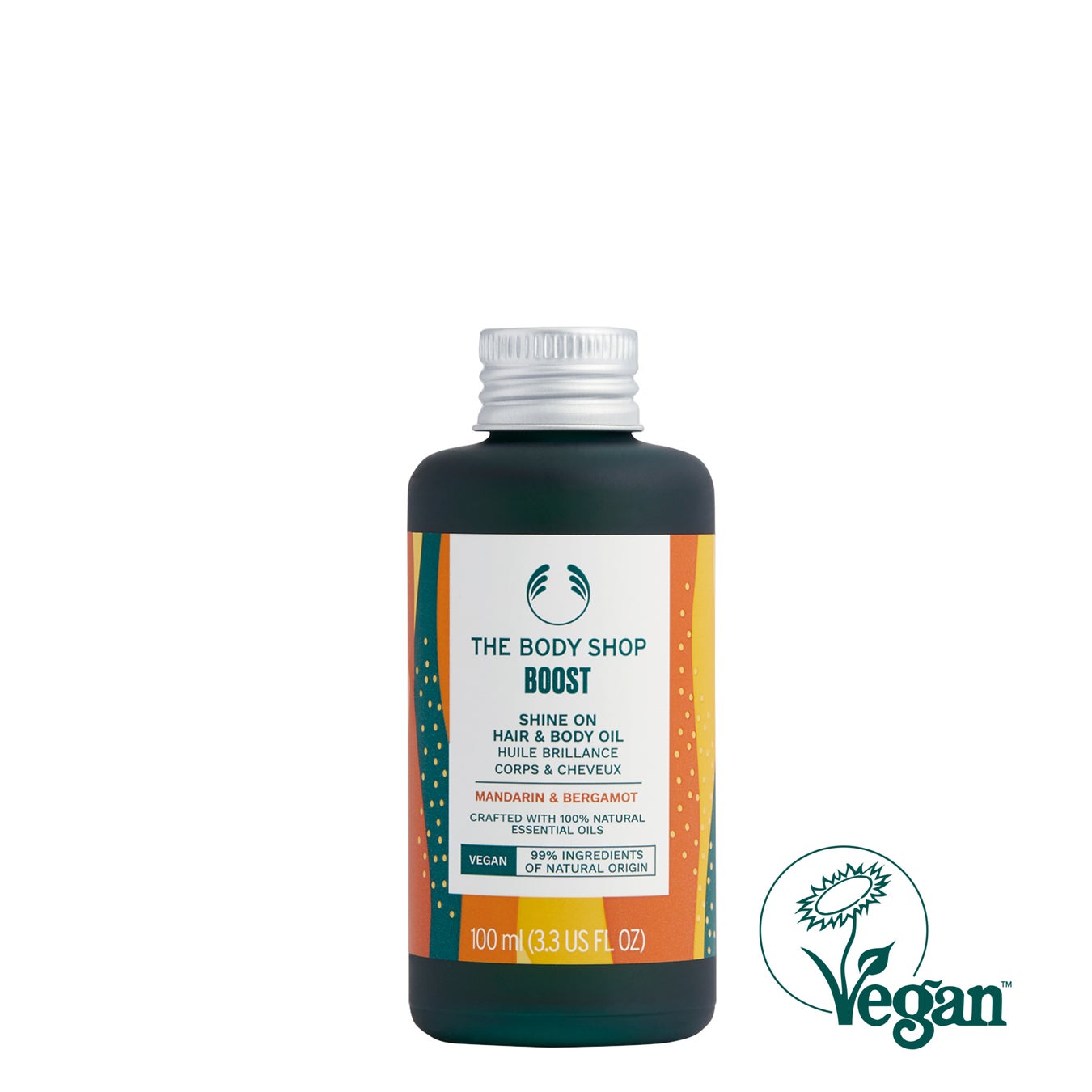 なじみの良い軽やかなオイルが、肌と髪に素早く輝きとうるおいを与えます。