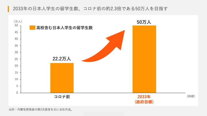コロナ禍で激減した留学生を増やすべく、政府の教育未来創造会議は4月に第2次提言をとりまとめ、「2033年までに日本人の海外留学生50万人」を目標に掲げました。コロナ禍以前の日本人留学者数は、高校生なども含めると22.2万人とみられるため、今後10年でコロナ前の約2.3倍の留学者数を目指すこととなります。 留学の促進については、19日から21日にかけて開催されたG7首脳会議(広島サミット)でも議題の一つとして取り上げられるとされていました。