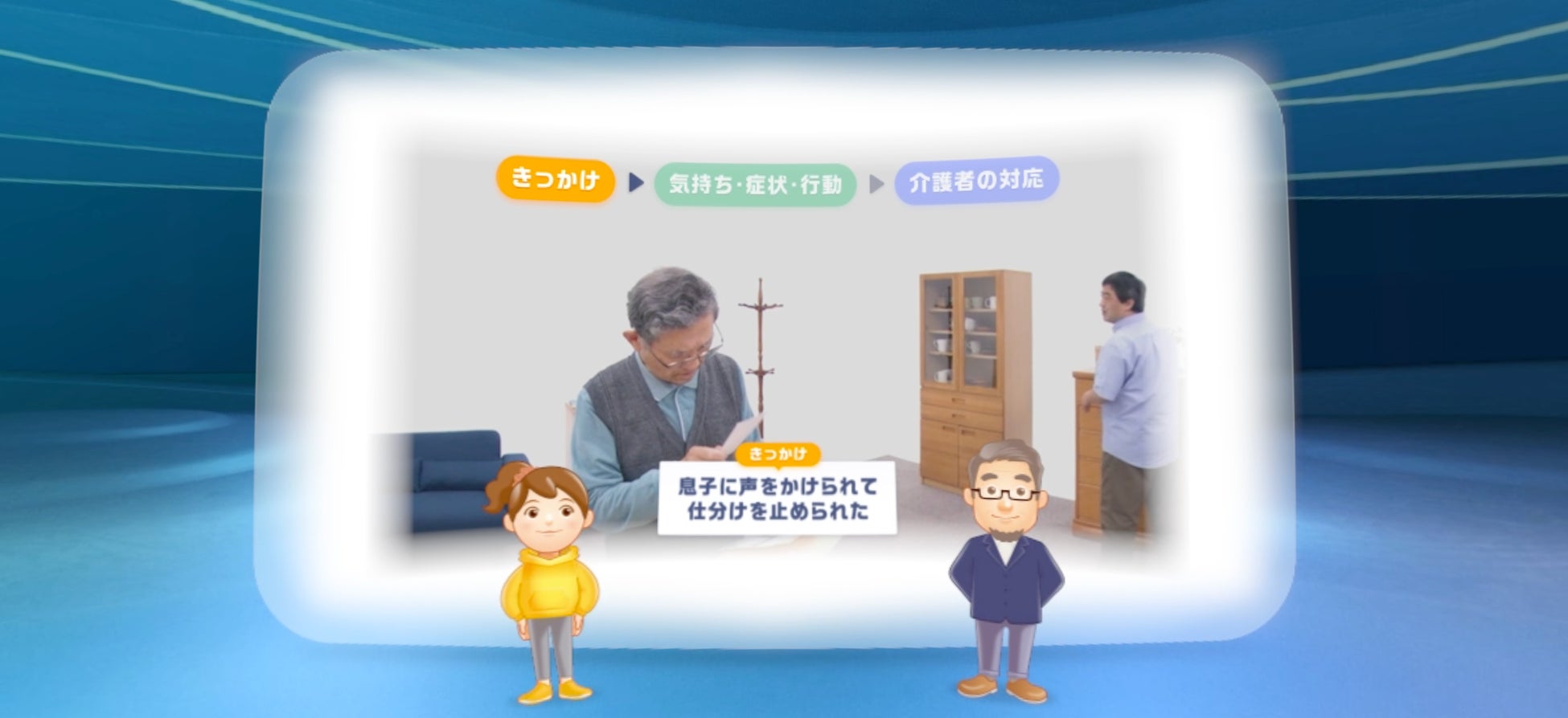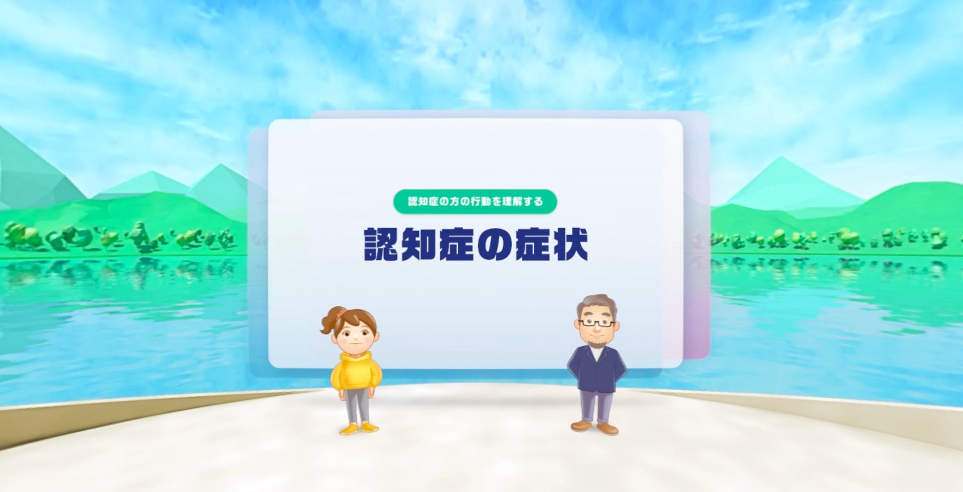 「認知症ケア支援VR」は、認知症の方のご家族や介護士をはじめとする介護者の方々が、認知症の方の気持ちや行動の背景を知り、具体的な対応を学ぶための、専門医監修の体験型VRトレーニングプログラムです。