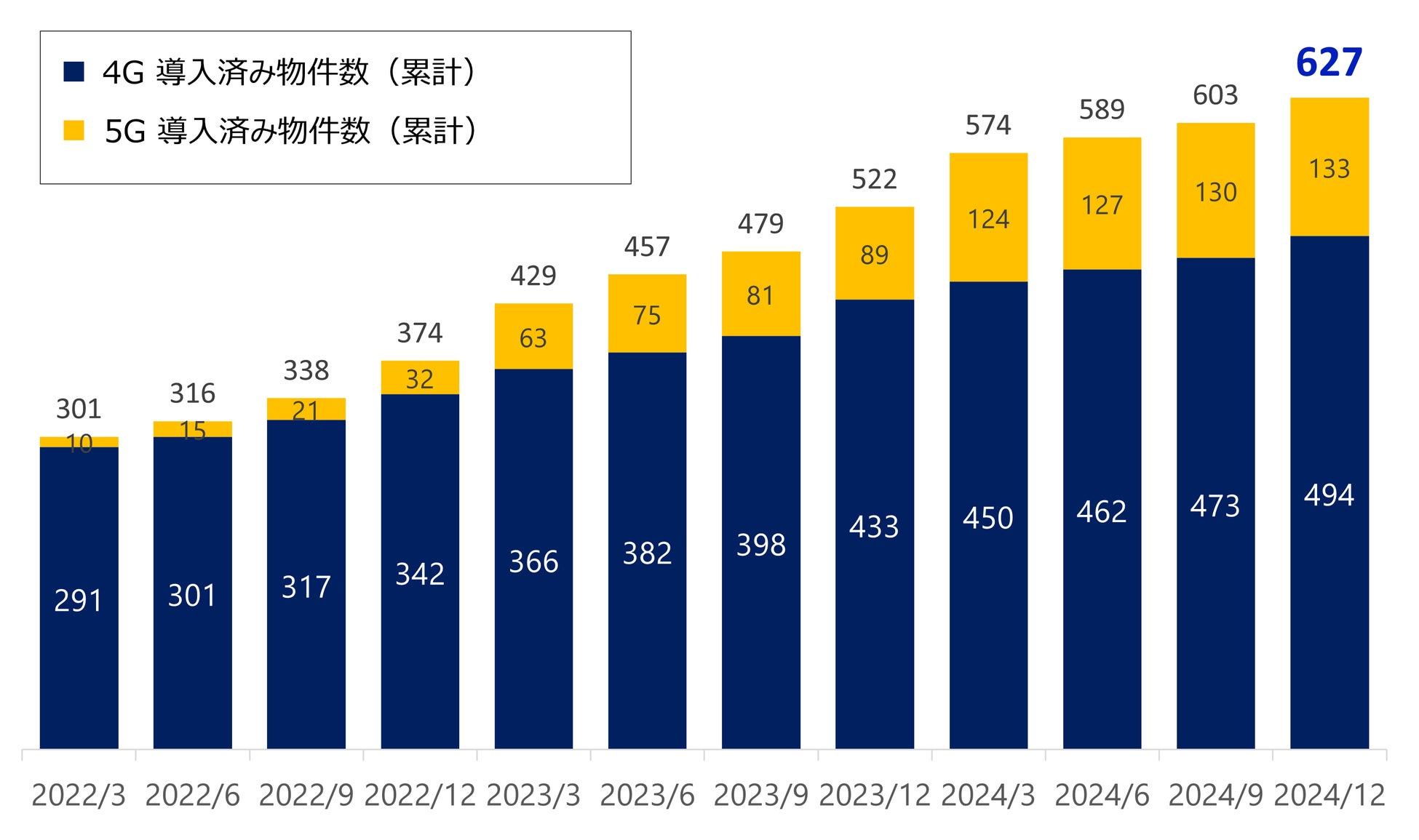 2024年12月時点の累計導入済物件数(4G/5G、国内)は627件(前年同期比120%)となりました。