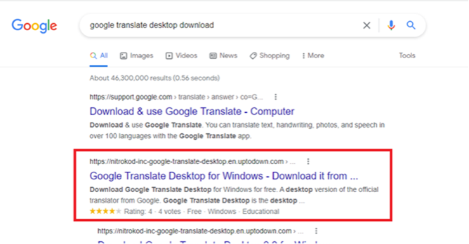 この攻撃キャンペーンでは、SoftpediaやUptodownといった知名度の高いウェブサイトから入手できる無料ソフトウェアを偽装し、それらを介してマルウェアを拡散しています。また、ユーザーがGoogle上で「Google Translate Desktop download(Google翻訳デスクトップ版ダウンロード)」と検索すると、実在しないデスクトップ版アプリケーションに偽装した悪質なソフトウェアが容易に上位表示されます。悪質なソフトウェアをインストールすると、攻撃者は数週間にわたって感染プロセスを引き延ばし、その間に最初のインストールの痕跡を削除します。