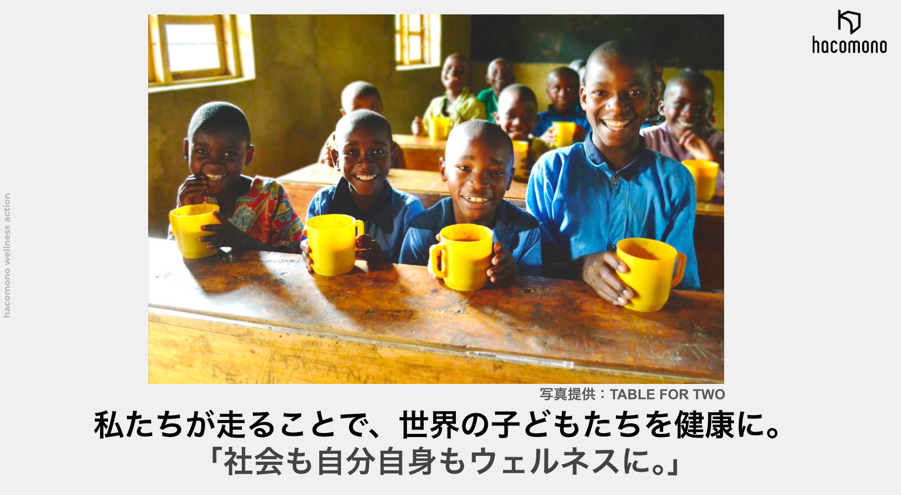 「ウェルネス産業を、新次元へ。」をミッションにウェルネス/運動施設向けオールインワン・マネジメントシステム「hacomono」を提供する株式会社hacomono(東京都渋谷区:代表取締役CEO 蓮田 健一)は、2024年10月17日(木)から11月16日(土)まで、社内企画「Run for #ウェルネスアクション」にて、社員のランニング消費200kcalにつき開発途上国の子どもに給食10食分を寄付する企画を実施し、累計消費 457,000カロリーにて、22,850食分の寄付を行いました。2021年より開始し、今年で4回目の実施となりました。