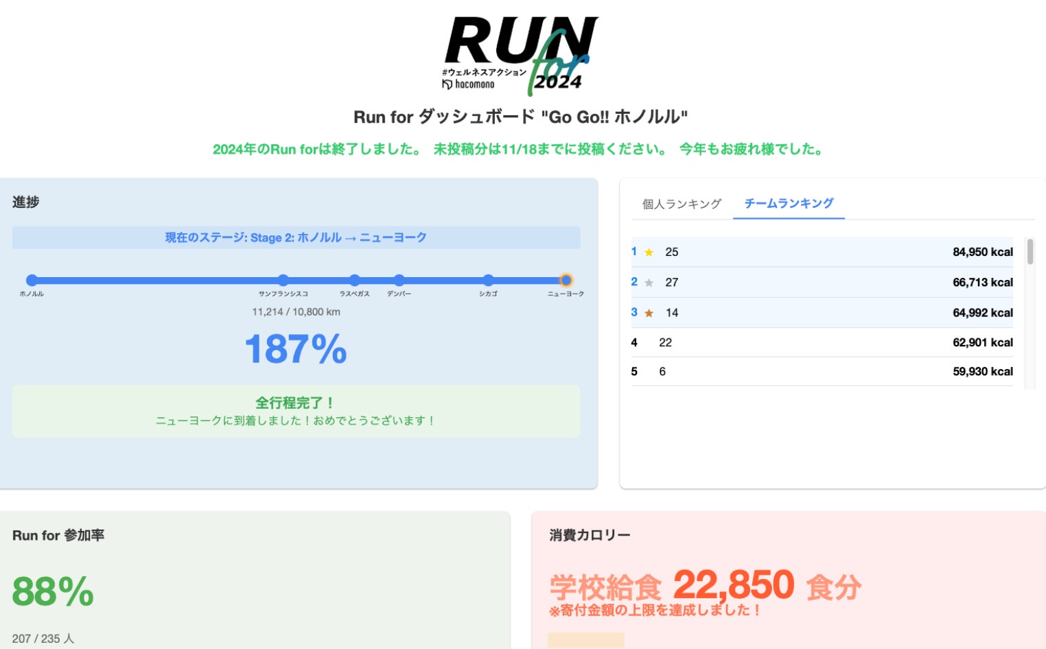 社内エンジニアが「RUN for」用のダッシュボードを開発し、現在のランキングやカロリー消費数、参加率を一目で確認できるようにしました。このダッシュボードにより、目標達成度やチーム・個人ランキングをリアルタイムで把握できるため、ゲーム感覚で楽しみながらも競争意識が高まり、社員の参加動機が増すようになりました。