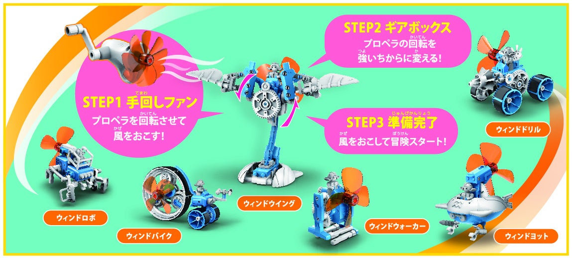 ウィンディーは風のチカラで動く6タイプのメカに組み替え可能なロボット組立キットです。乾電池など、他のエネルギーは使用しません。手回しで風を起こすことができるファン(付属)を回すことで、部屋の中でも風のパワーによる動きを体験できます。風のチカラでいろんなメカが動く仕組みを学んで体験しましょう。