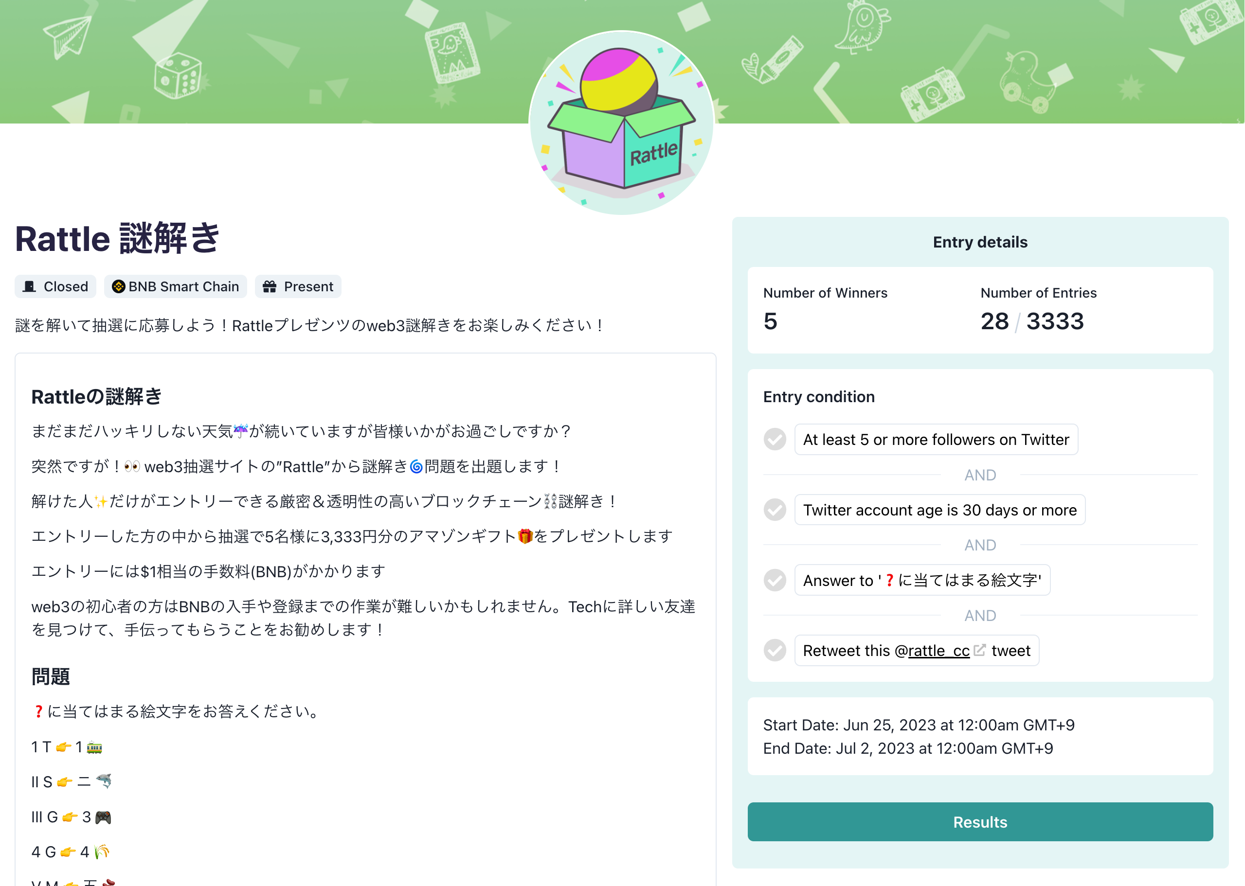 「Rattle」は、ブロックチェーン上で抽選会を開催できるDApps(分散型アプリケーション)です。『Web3(※3)を浸透させ、企業による不透明な抽選方法やBot等を活用して大量に応募するなど、不公正な抽選キャンペーンをなくしたい』という想いから、ファウンダーである大西秀典氏が個人開発を行い、2022年末にベータ版をローンチいたしました。以後、NFTのプロモーションおよび抽選を実施するための、NFTクリエイター向けプラットフォームとして、国内最大級の仮想通貨コミュニティである「KudasaiJP」を中心に、これまでに180回のキャンペーンを開催し、およそ5,500人がユーザ登録(ウォレット連携)し、利用しています。
