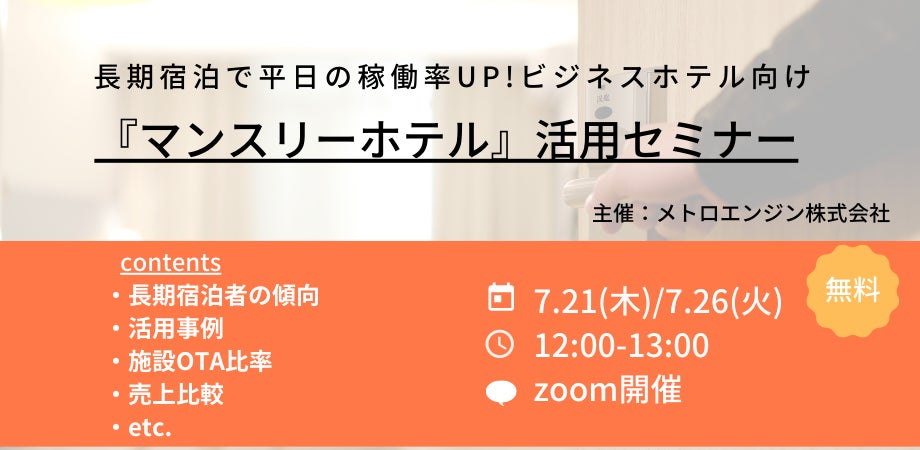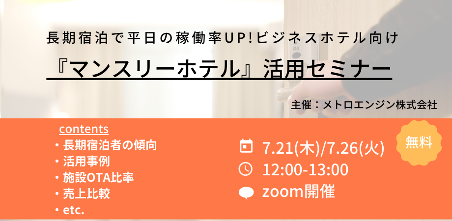 【7/21(木)・7/26(火)の2回開催】長期宿泊で平日の稼働率UP!ビジネスホテル向け『マンスリーホテル』活用セミナー