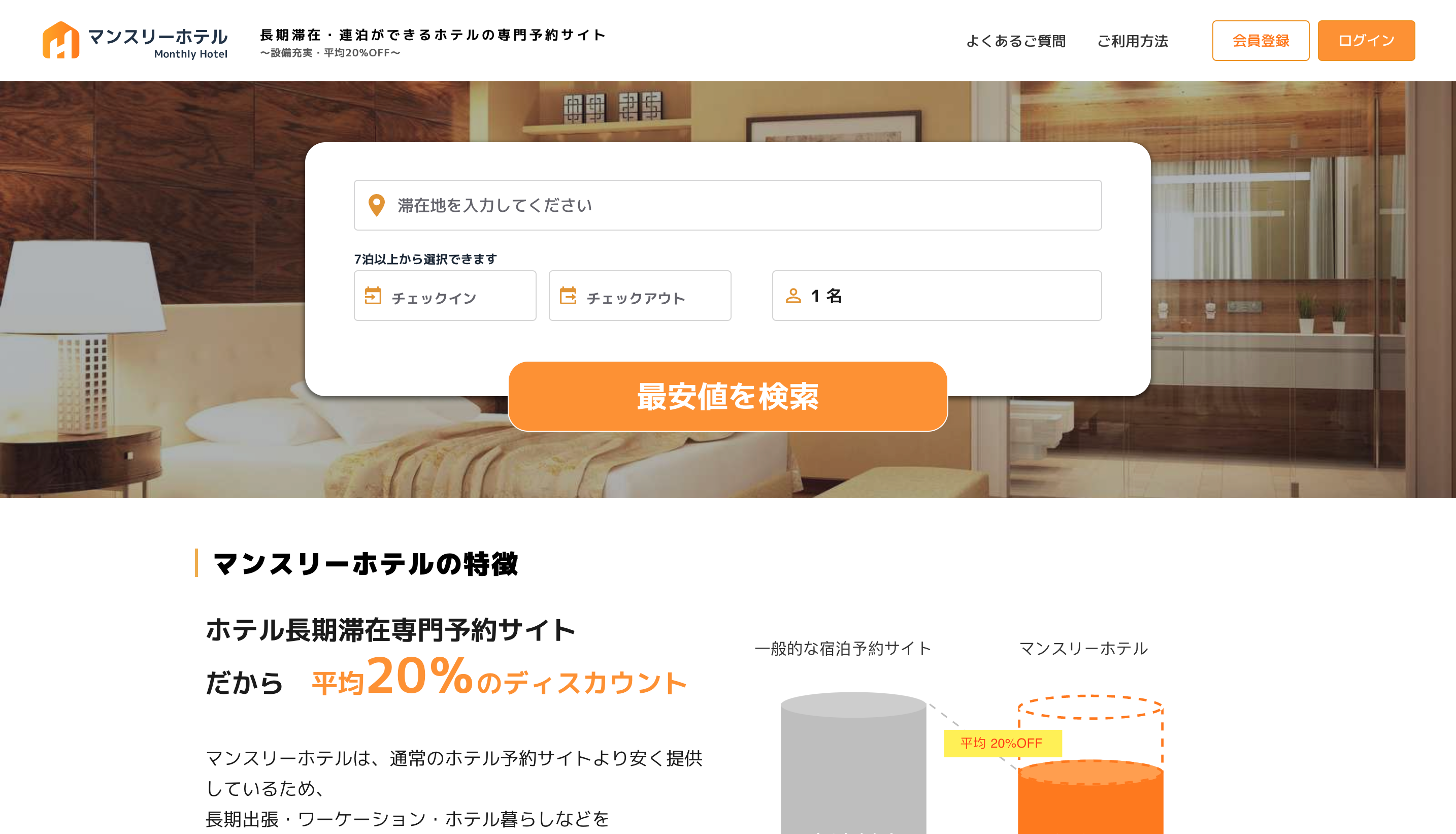 ① 7日間以上、半年までの長期予約がリーズナブルな長期滞在専門ホテル予約サイトです。サイト内には、長期利用が可能なホテルのみが掲載され、現地決済にも対応。1泊当たりの宿泊値(ADR)の最安値より20%以上割引したお得なプランを提供します。会員登録費や水光熱費など無駄な手数料もかかりません。