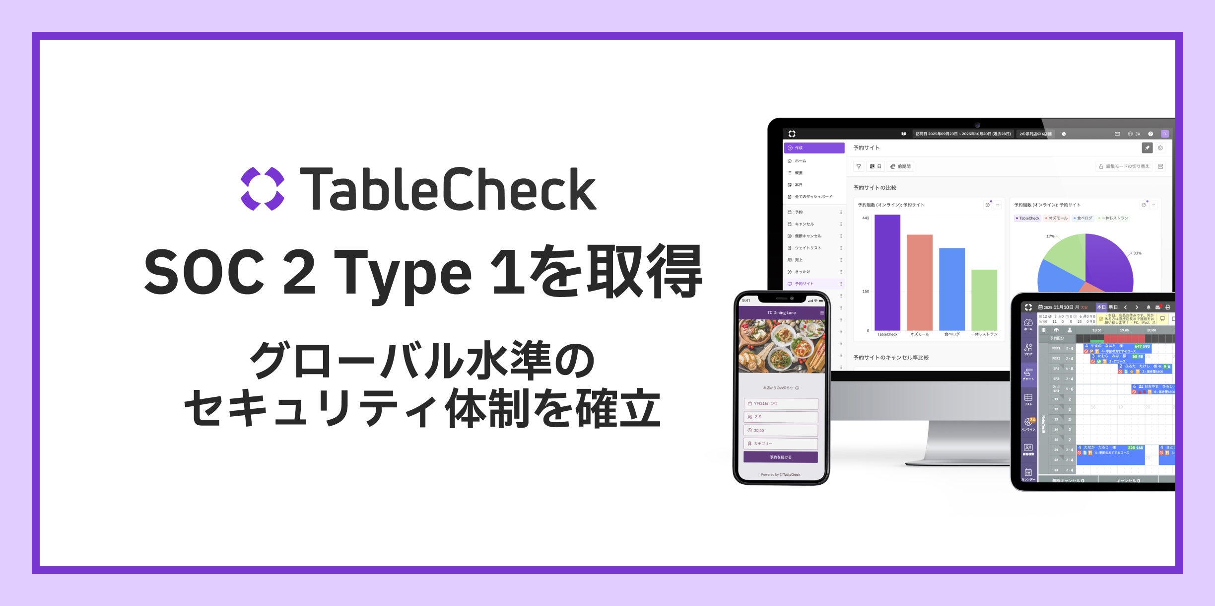 株式会社TableCheck(本社:東京都中央区、代表取締役社長:谷口 優、以下、「テーブルチェック」)は、このたび、米国公認会計士協会(AICPA)のTrustサービス基準に基づく「SOC 2 Type 1」保証報告書を取得しました。