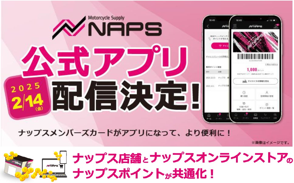 オートバイ用品の小売・開発を行う株式会社ナップス(本社:神奈川県横浜市、代表取締役:望月 真裕 以下、「ナップス」)は、2025年2月14日(金)に、初の公式スマホ用アプリ『ナップス アプリ』をリリースします。
