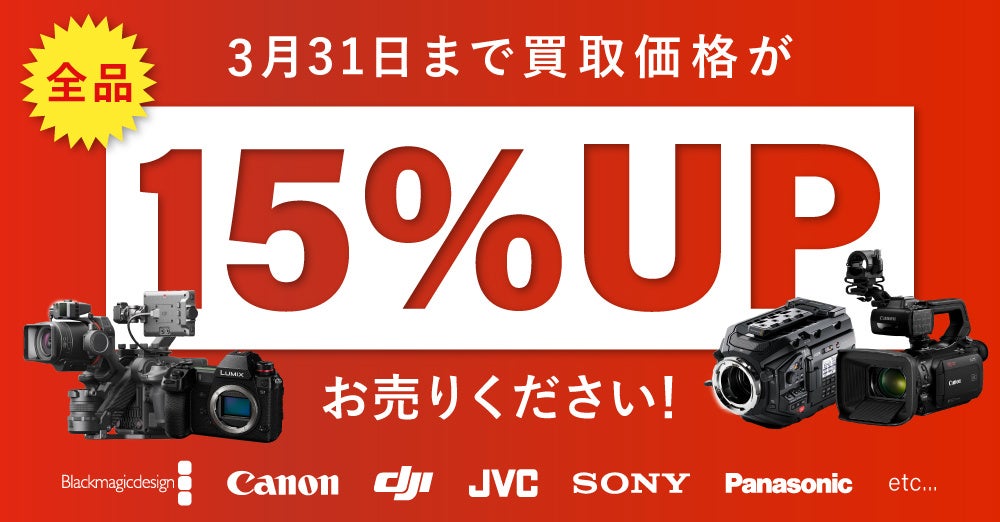 キャンペーン期間中は、映像機器・音響機器・ドローン製品など、当社買取対象ジャンル全品、通常買取価格から15%アップで買取いたします。新規購入をともなう下取りなら5%加算で合計20%にアップ。当社指定カメラへの乗り換えならキャッシュバック適用でさらに増額のチャンスです。