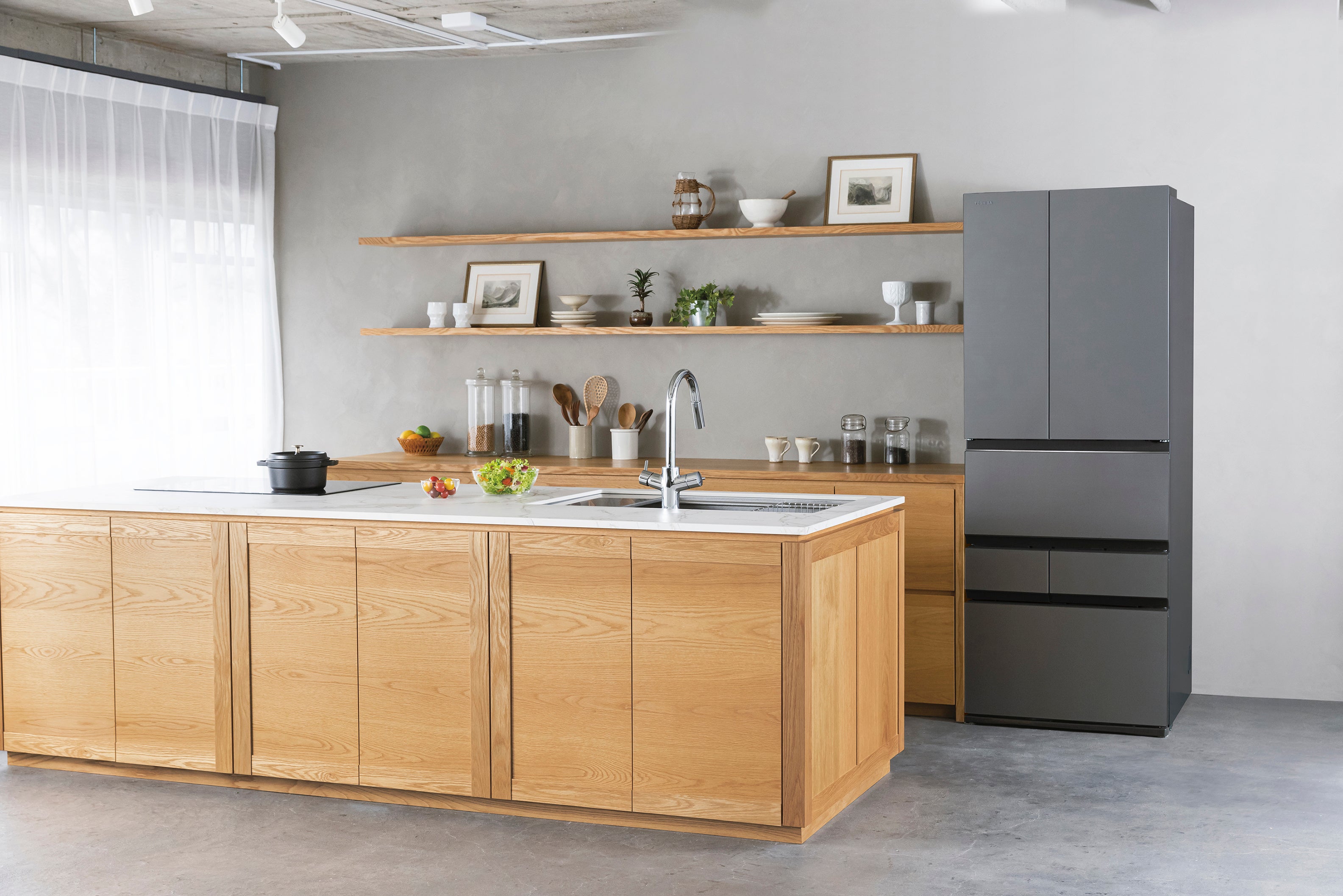 水平垂直基調な外観がもたらす、凛として静かな佇まいは、まさに引き算の美学である。ブランドロゴもミラー印刷から本体扉と同色のグレーにまとめ上げるなど、徹底してその佇まいのノイズとなりうる要素を見直している。しかし単に要素を引いたデザインではなく、ひと拭きで掃除ができる高い清掃性を実現する直線の掘り込みハンドルなど、造形のシンプルさが機能の向上を生む丁寧で緻密なデザインに評価が集まった。