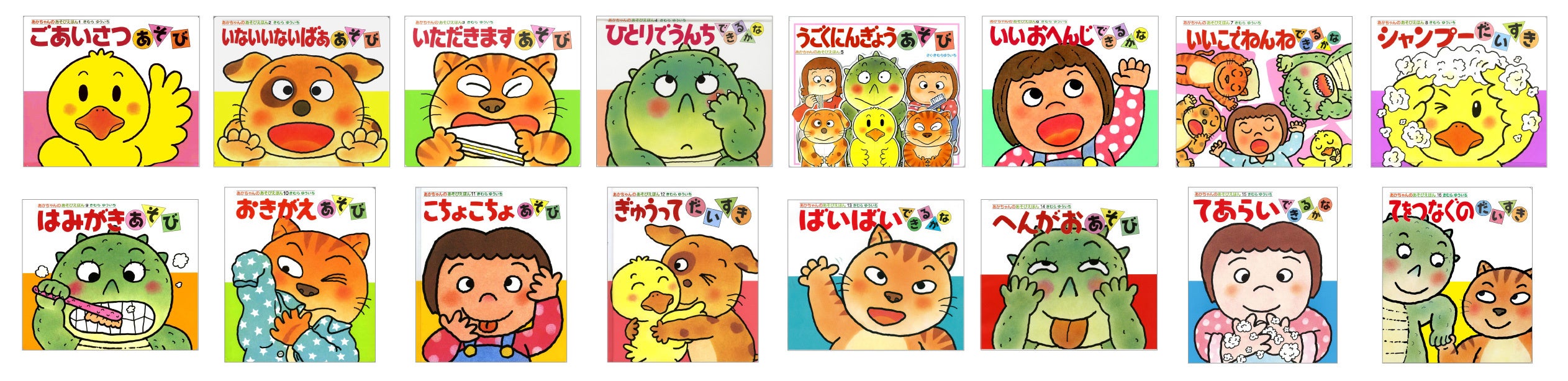 ▲トイレやシャンプー、はみがきなど、生活習慣が自然に身につく作品と、こちょこちょや変顔など、親子でスキンシップをとれる作品がずらり。どれも赤ちゃんや子どもたちに身近なテーマで、まねっこ遊びもしやすくなっています。