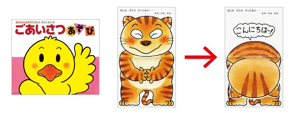 ▲シリーズ第1作『ごあいさつあそび』の中ページ。ねこのミケのおかおを下にめくると、「こんにちはー!」と元気にごあいさつします。