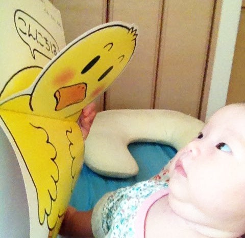 0歳の赤ちゃんだと、まだ内容を理解するのは難しいかな? と思いがちですが、くっきりした色と表情のキャラクターたちは赤ちゃんの目にも見えやすく、生後2か月の赤ちゃんがじーっと見る姿も!
