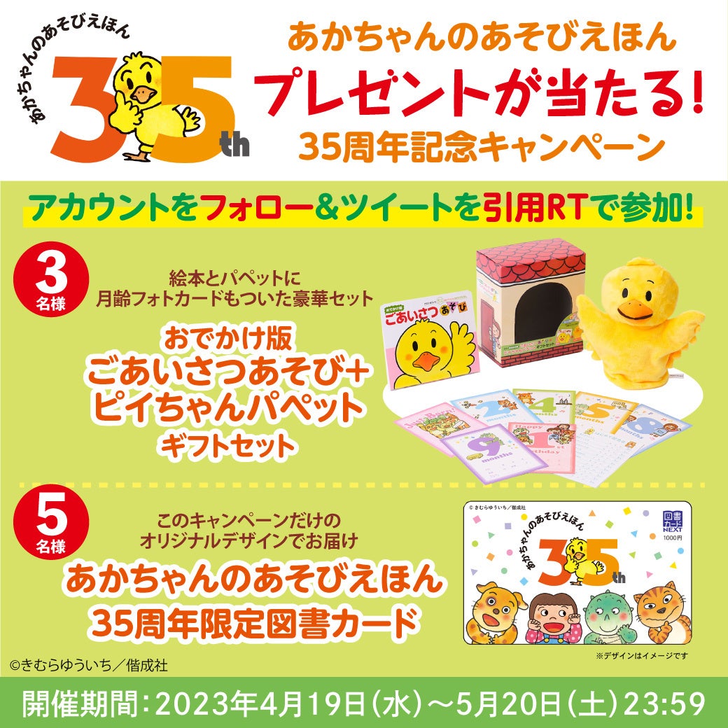 4月19日〜、最新刊の発売と合わせて開催! フォロー&引用RTで、3名の方に『おでかけ版 ごあいさつあそび+ピイちゃんパペットギフトセット』、5名の方に「あかちゃんのあそびえほん 35周年限定図書カード」1,000円分が当たります。(開催期間:5月20日まで)