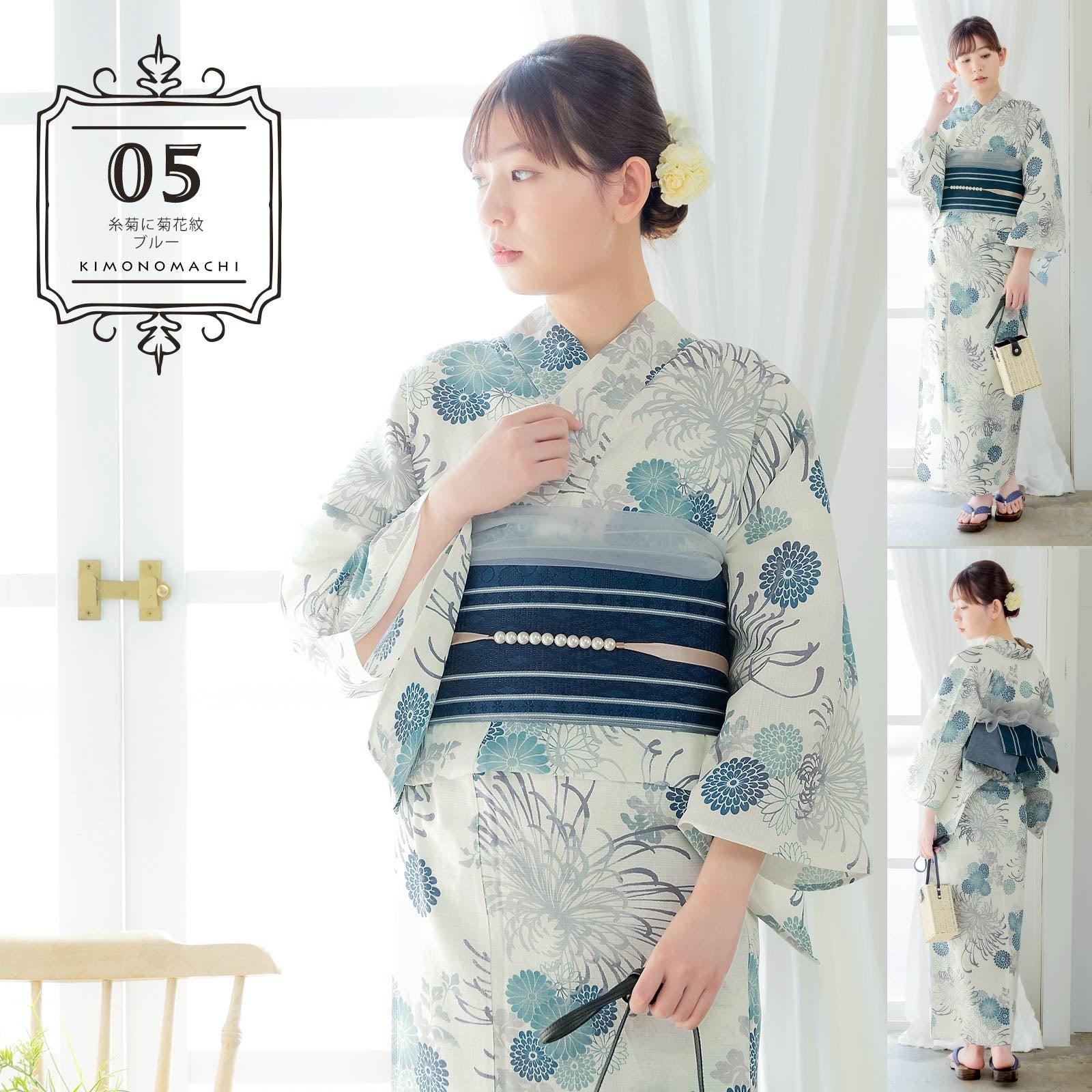 ブルー:アイボリーの地に、グレーと青紫のぼかしの入った大きな糸菊の花。紺や浅葱色、ブルーグレーの菊の花紋にグレーの葉。糸菊の繊細な華やかさとシックな配色が大人っぽい雰囲気です。