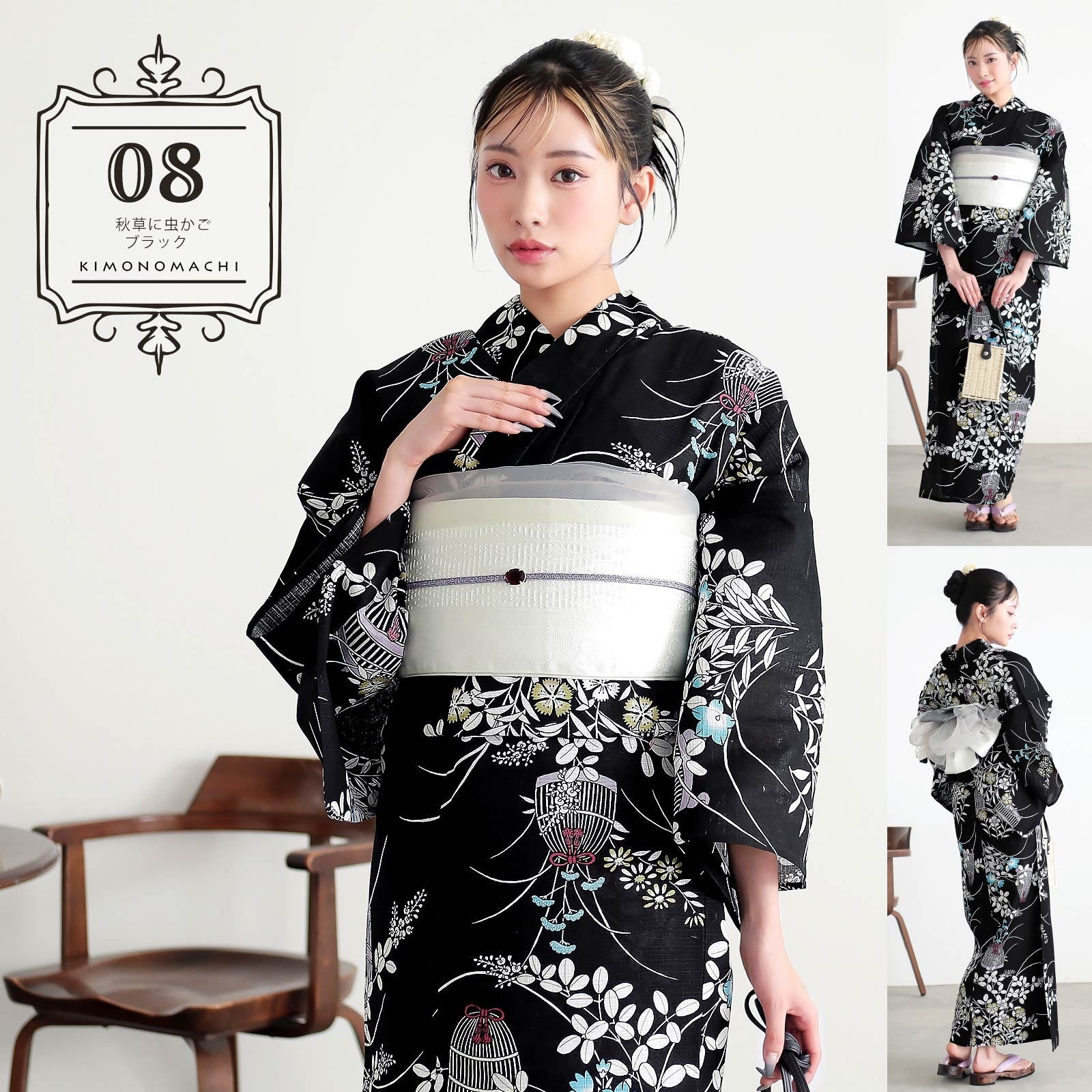 ブラック:黒地に白抜きで表現された萩や桔梗、撫子、芝草の秋草文様にグレイッシュな淡いブルーや浅い抹茶色の挿し色。白に藤色、臙脂の紐を添えた虫かごが物語を感じさせます。