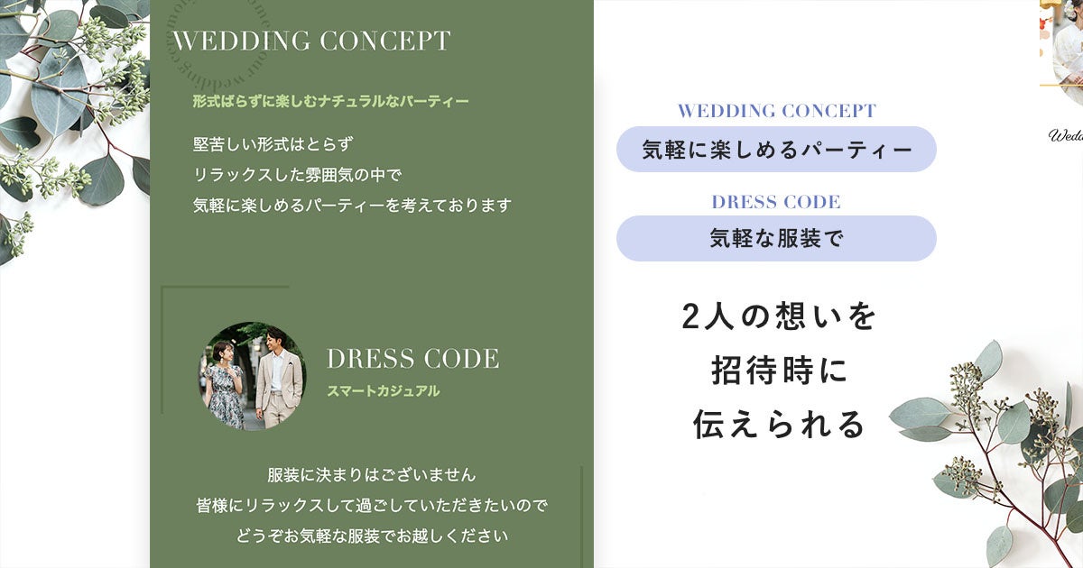 これによりゲストも「どんな式なのか」「どんな服装で行けばよいのか」といった不安を事前に解消でき、主催者・ゲスト双方にとって満足度の高い結婚式の実現をサポートします。