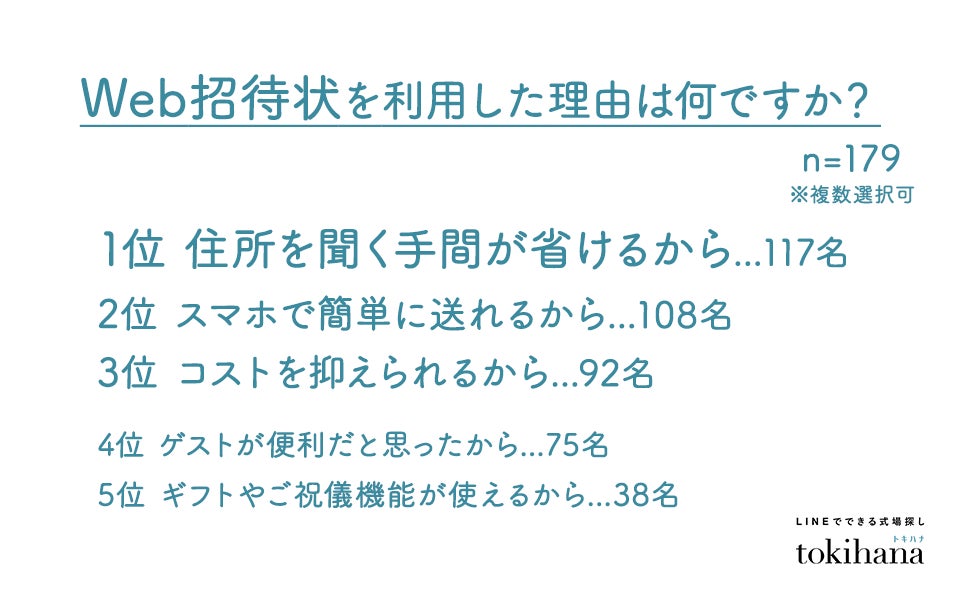「Web招待状」を利用した理由として、「住所を聞く手間が省ける」「スマホで簡単に送れる」「コストを抑えられる」など、効率性を重視する声が多数。