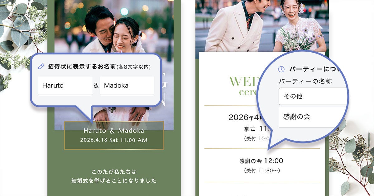 たとえば、「新郎新婦」という表記にこだわらず、名前の順番を自由に設定できるなど、ジェンダーや形式にとらわれない柔軟な設計を採用。