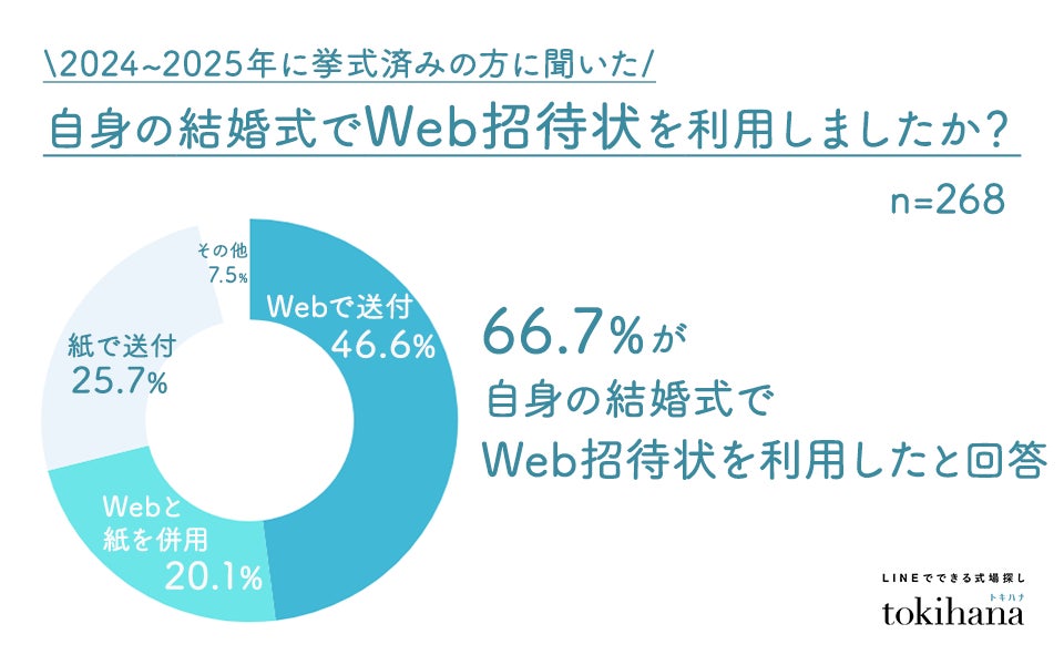 2024~2025年に結婚式を挙げた20〜30代の男女268名を対象に調査したところ「Web招待状」を取り入れた主催者は全体の約7割にのぼりました。