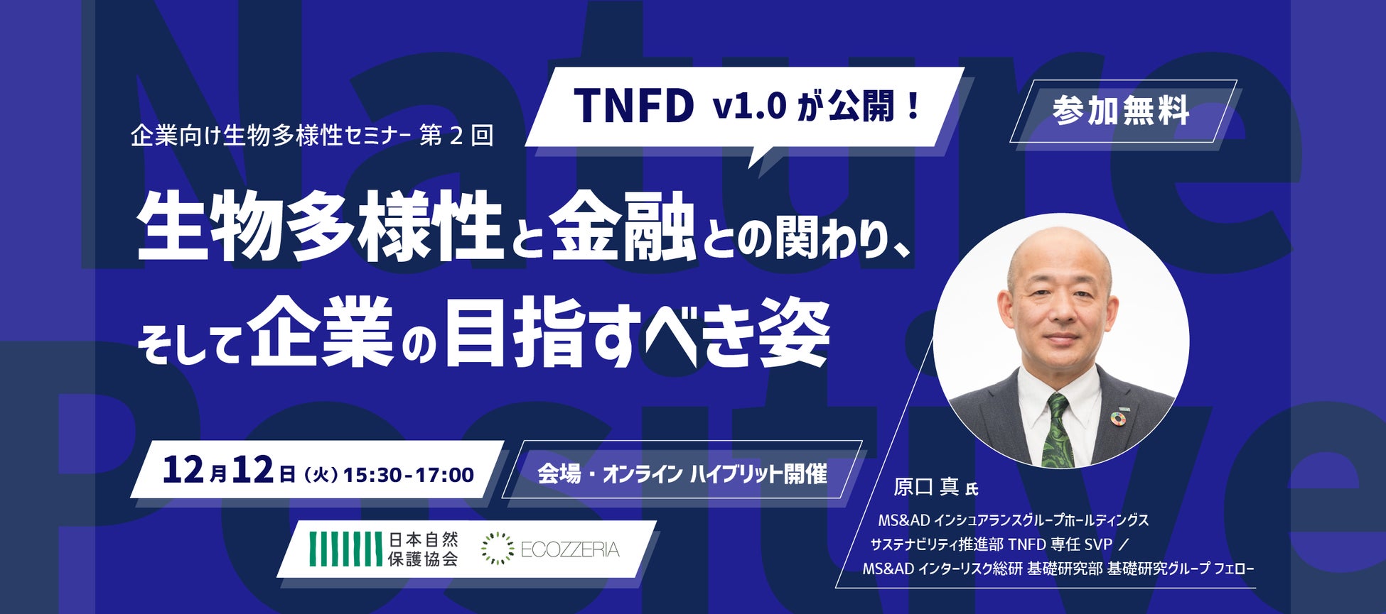 ● 第2回は「TNFDv1.0が公開!生物多様性と金融との関わり、そして企業の目指すべき姿」と題し12/12(火)に開催