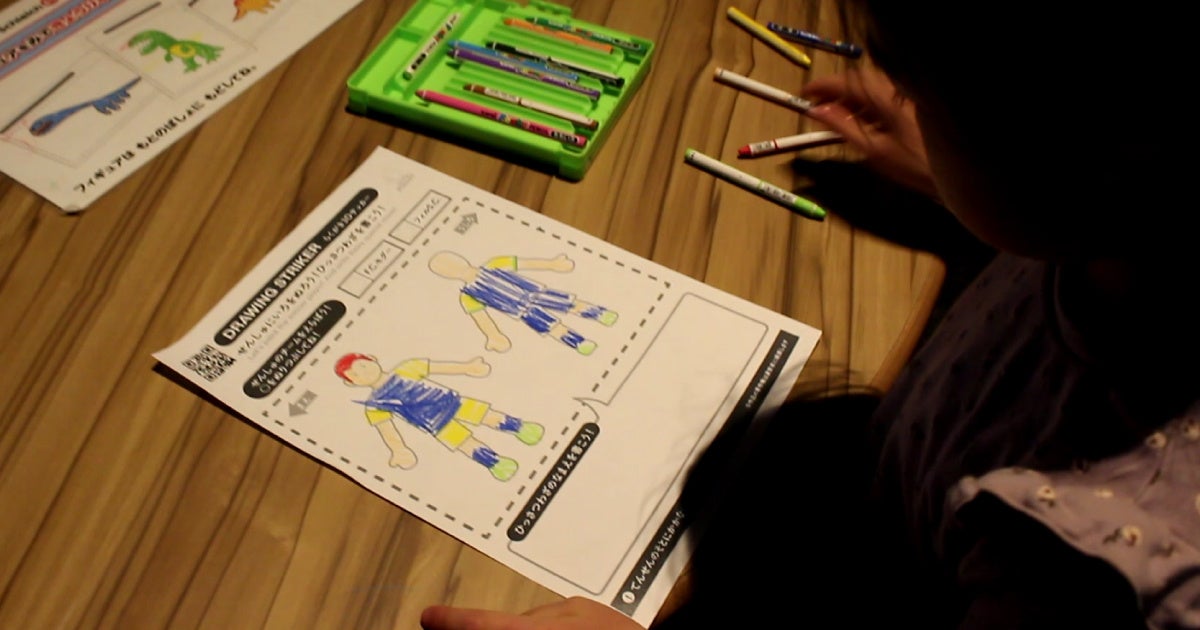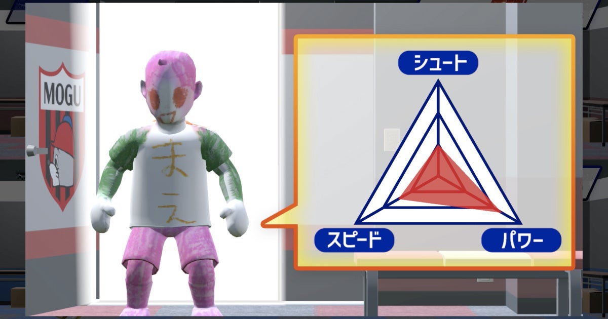 お絵かきは「ぬりえ」または「らくがき(白紙の用紙)」の2種類から選択可能で、塗った色によって選手のスピードやシュート力などのスキルが変化します。登場選手のスキルによって試合結果も変化するため、自分だけの“最強のストライカー”を創り出して楽しむことができます。