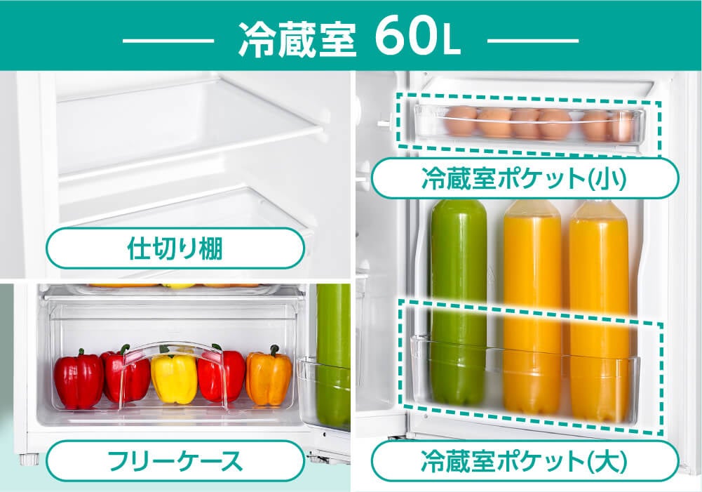 1Rや1Kのお部屋など、小さめのスペースにも置きやすいコンパクトなサイズ(W47.4×H85.7×D50.0cm)ながら、一人暮らしに十分な85Lの大容量です。冷凍食品が多くなりがちな一人暮らしの食事に合わせ、冷凍室には最高水準の冷凍性能を搭載し、冷蔵室は整理しやすいようにドアポケットやフリーケースなどを付属しました。