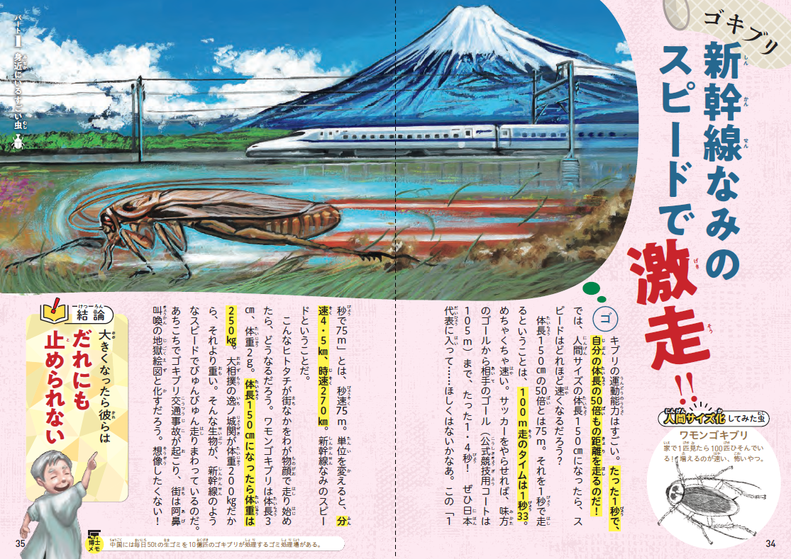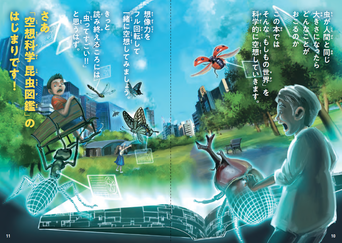 本書は、昆虫が人間と同じサイズになった“もしもの世界”で起きる出来事を科学的に解説した図鑑です。著者は『空想科学シリーズ』で知られる、空想科学研究所の柳田理科雄さん。監修は昆虫学者の丸山宗利さんが担当しました。