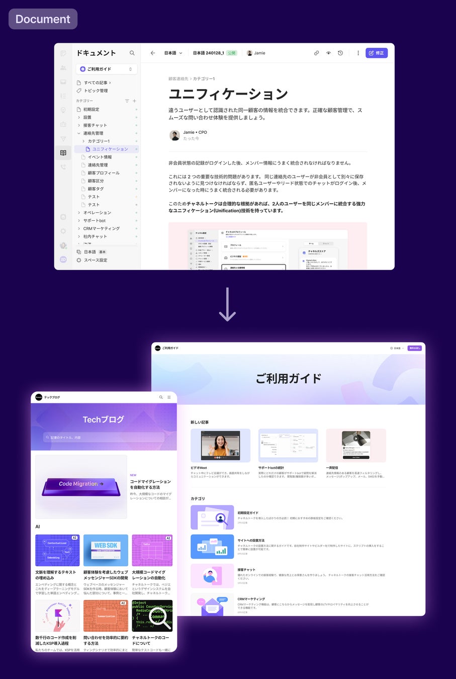 チャネルトークの管理画面からコンテンツ作成を行う機能です。ドキュメントに記載されている内容がデータベースとなり、ALFが参照することでユーザーの回答に活用します。URLインポートを活用することでワンクリックで記事作成ができるため、既存コンテンツがある場合は最小限のリソースでALF運用をスタートできます。作成したコンテンツをSEO記事として活用することでマーケティング・CS同時に施策を展開することが可能です。
