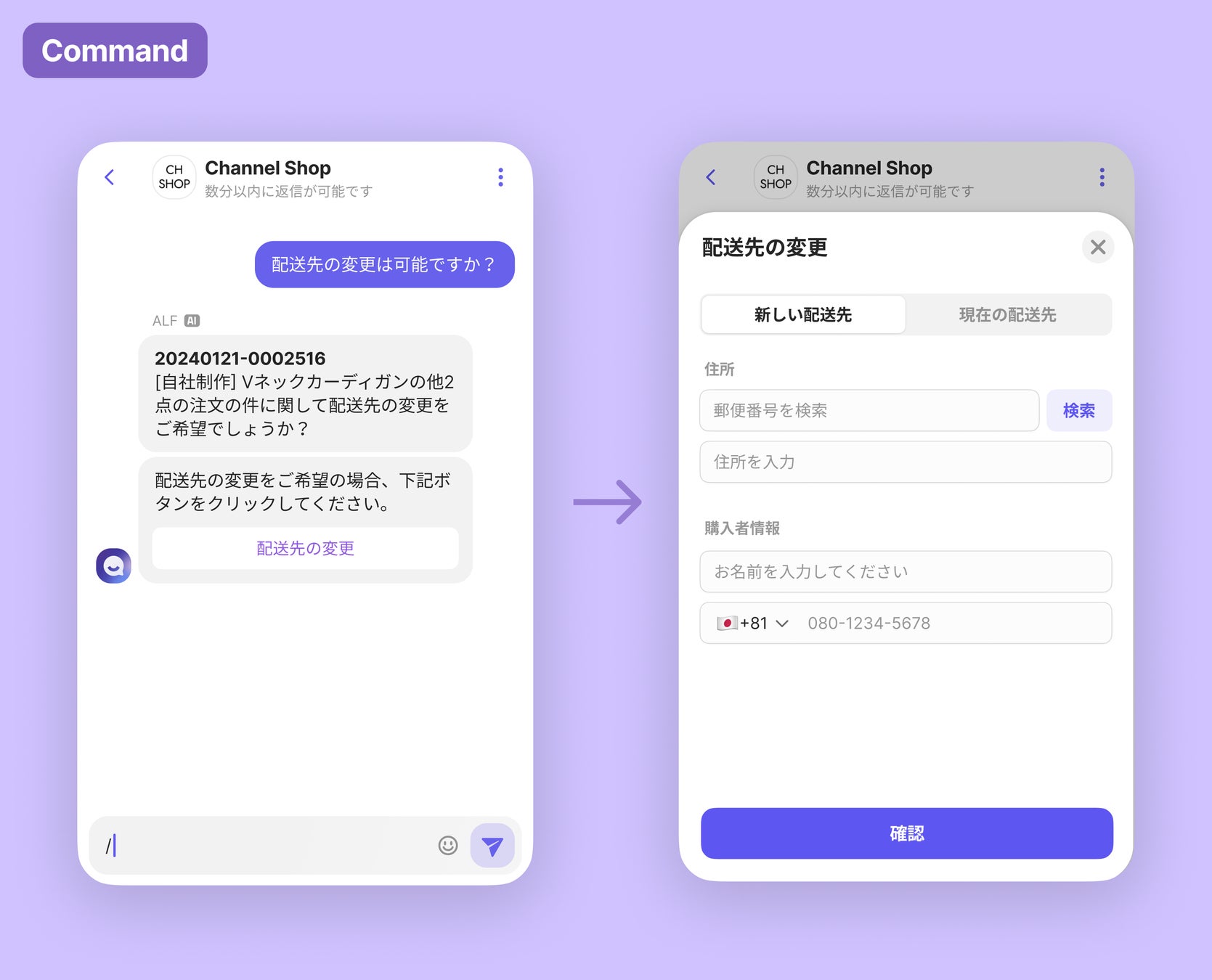 ユーザーからのキーワード入力を通じて特定の機能を実行する「コマンド」を開発しました。顧客が問い合わせを通じて「コマンド」を実行すると、インストールしたアプリに内蔵された機能がチャネルトークのUI内で作動します。