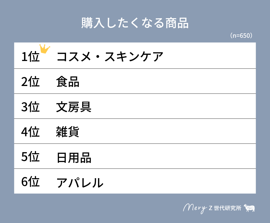 続いて、「どのような商品だと購入したくなるか」のアンケートでは、1位の「コスメ・スキンケア」が2位と大きく差をつける結果となった。