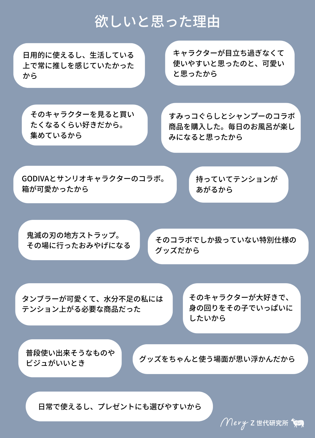 「欲しいと思った理由のコメント」では、「グッズを使う場面が思い浮かんだ」「そのコラボでしか扱っていないグッズだから」といったコメントが見られた。