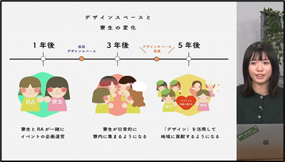 「寮生と寮づくり」を目標に活動。寮生から意見を集め、工作体験型ワークショップを開催。寮生とRAが協力し合える環境づくりを進めた。また寮内に創造を生み出す空間「デザインスペース」の制作を提案。大学で学んだことを日常にアウトプットすることで学生寮の価値が変わると発表しました。