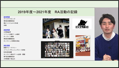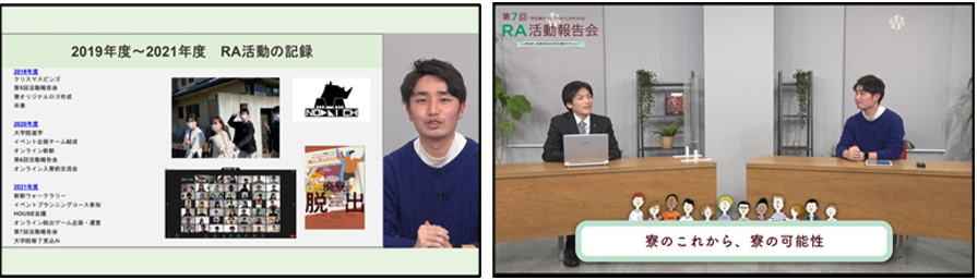 「退寮後も思い出に残る寮」を目指して活動。RAの活動を知ってもらうためSNS活用の見直し、寮内交流を図るため、ロゴやトートバッグの作成や寄席の開催など独自の取り組みを紹介。「お互いを尊重し、尊敬し合う寮」として今後も寮生が活躍できる場所作りについて発表しました。