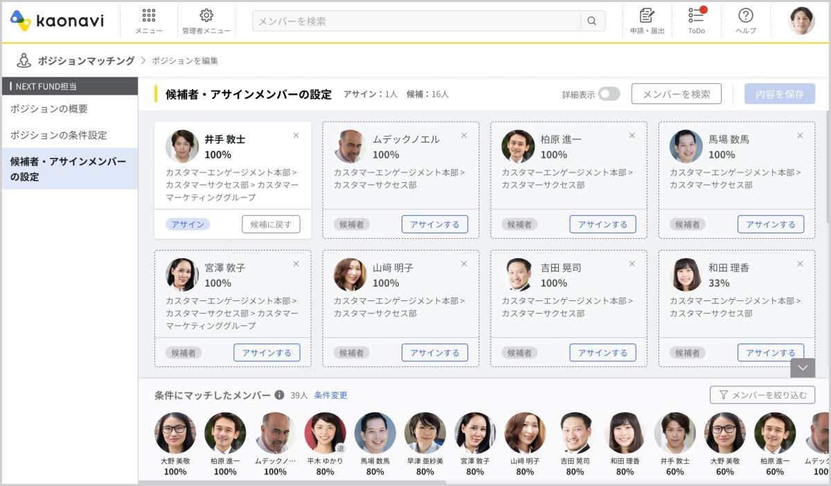 タレントマネジメントシステム「カオナビ」に蓄積している人材データベースをもとに、ポジション要件の定義から、候補者の抽出、アサインまでサポートします。また、2024年には社内公募機能も追加予定です。
