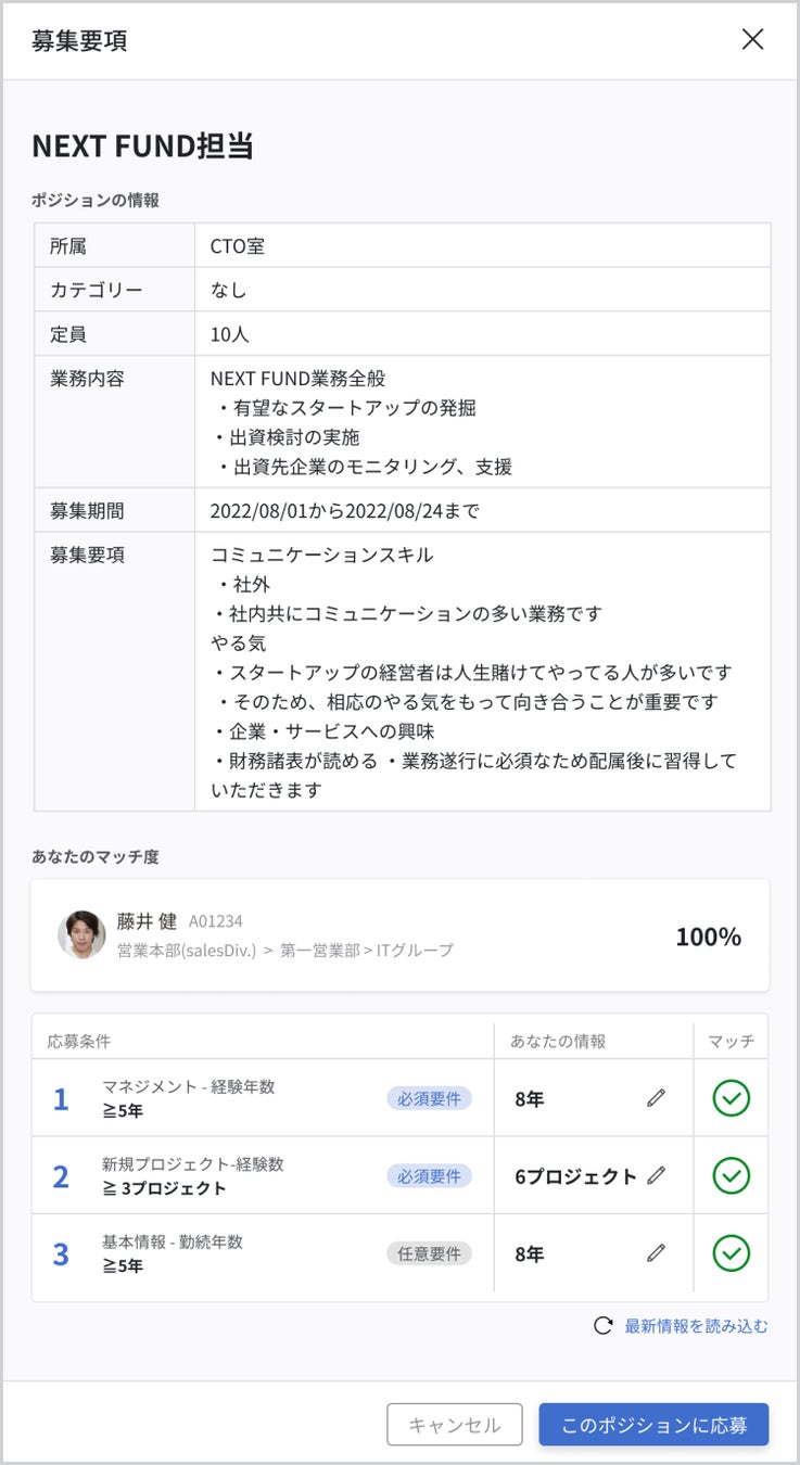 2)候補者の抽出:ポジション要件にマッチした社員を自動抽出し、条件とのマッチ度をパーセンテージで表示します。あとは候補者の中からアサインするだけです。また、人材データベースにポジションマッチングの結果を連携できるため、社員のポジション履歴を閲覧でき「キャリアの可視化」が可能です。