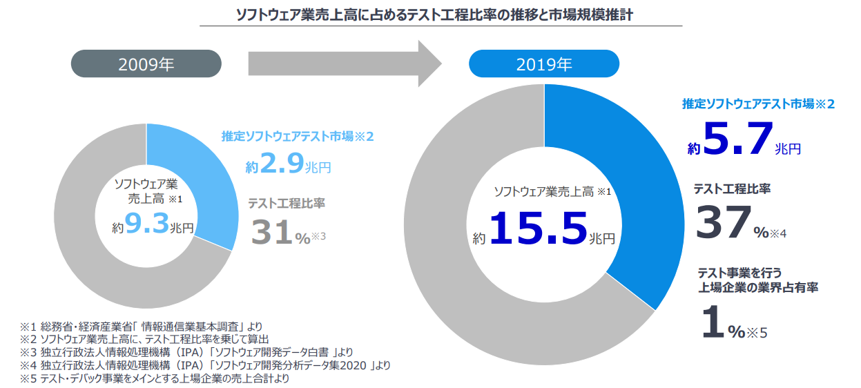 現在ソフトウェア開発の分野は加速度的に成長を遂げています。「IoT」分野やAIと呼ばれる「人工知能」分野などはその代表格です。ソフトウェア開発工程のうち、約3~4割がテスト工程にあたるとされており、テストだけの市場規模は5.7兆円。その一方、テスト専門会社へのアウトソース率は未だ1~2%に留まっている現状です。IT社会は進化し続け、テスト検証へのニーズは今後も更に高まると予測されます。