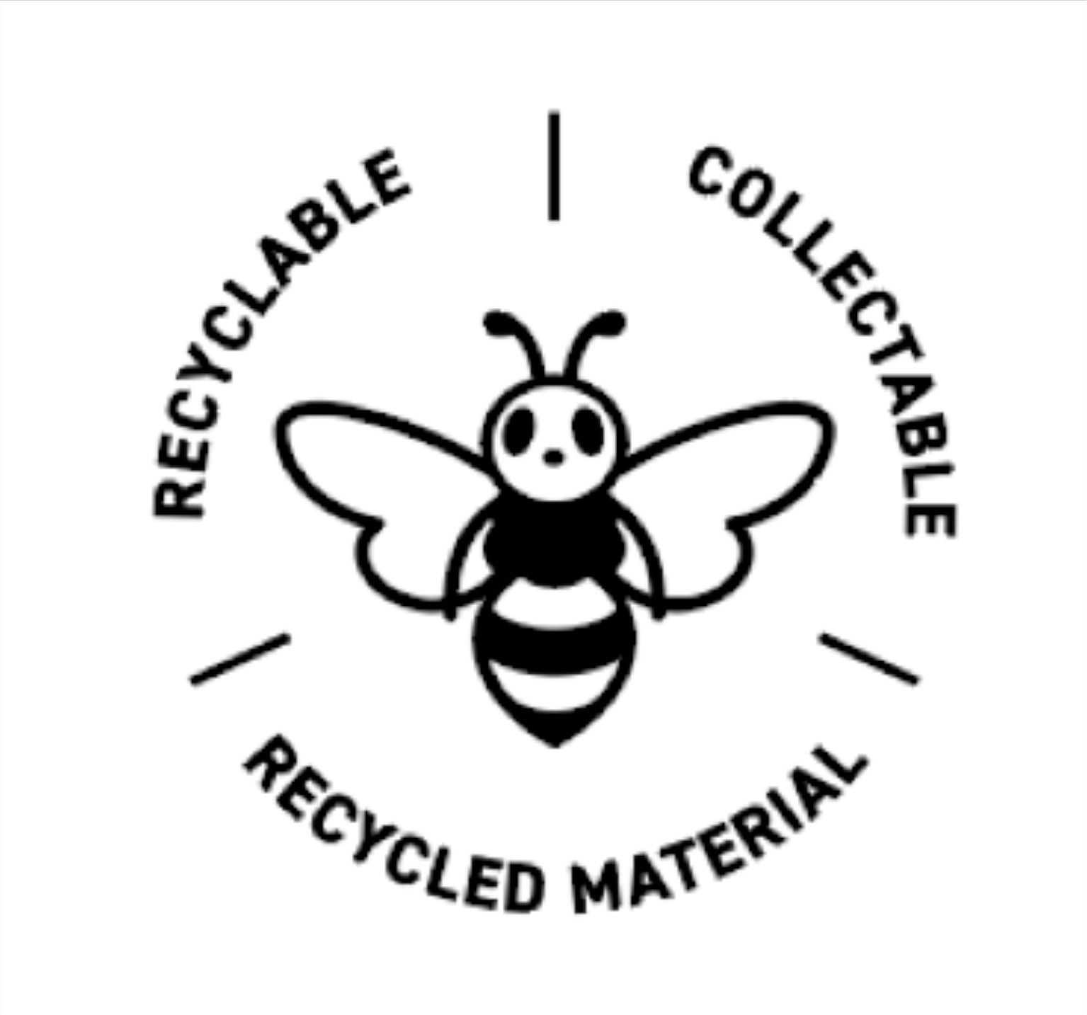 「COLLECTABLE」「RECYCLABLE」「RECYCLED MATERIAL」三つの意味があり、ハチの周りの円弧の有無により、その商品が満たしている条件を示します。