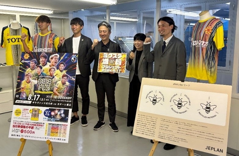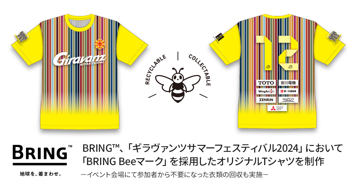 福岡県北九州市を拠点に活躍するプロサッカークラブ・ギラヴァンツ北九州は、サステナブルな大会運営に取り組んでいます。これまでも、BRINGと協働して大会会場で来場者から不要になった衣類の回収や、JEPLAN独自技術でリサイクルした100%繊維由来の再生ポリエステル樹脂を素材に使用したTシャツを採用するなど、環境に配慮した取り組みを両社で実施してきました。この度、BRINGハチマークを通じて衣類の資源循環の輪を広げる取り組み「BRING Beeマーク」を採用し、8月17日に開催する「ギラヴァンツサマーフェスティバル2024」においてBRINGのプラットフォームを通じた衣類の資源循環に取り組むことを発表しました。